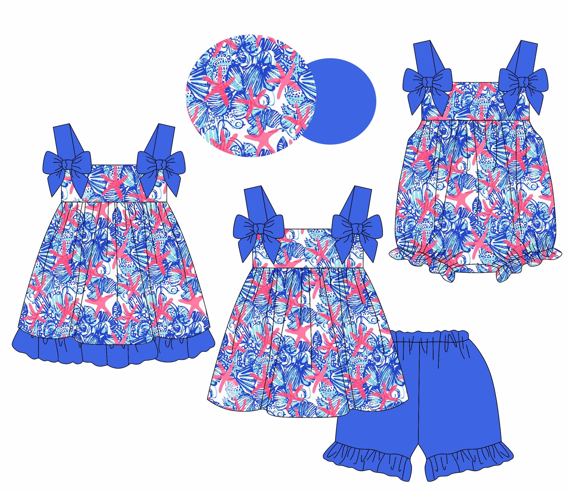 Baby Girl Straps Starfish Shell Blue Bows Sibling Romper Dress Set ( Moq 5 Each Style ) 1.24