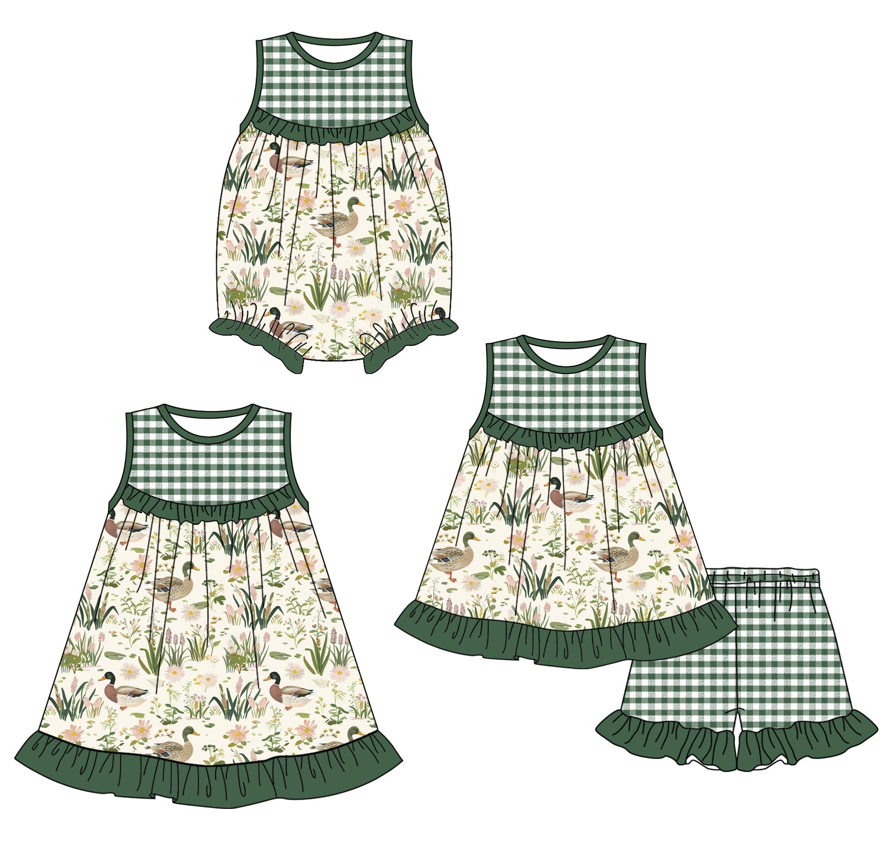 Baby Girl Ducks Green Checked Sibling Romper Dress Set ( Moq 5 Each Style ) 1.24