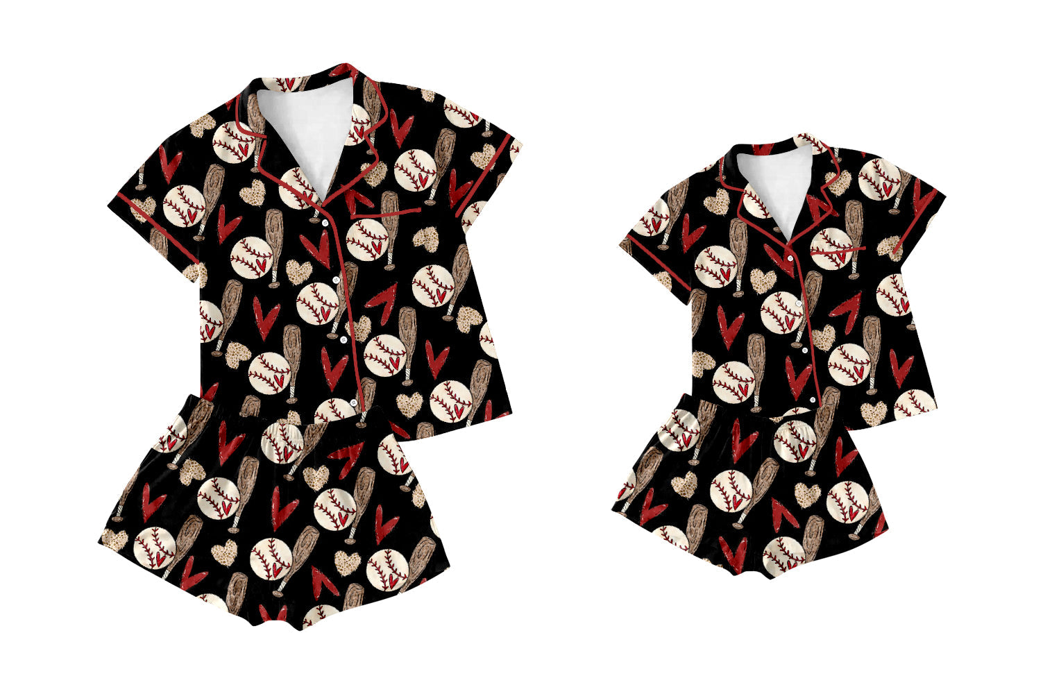 Baby Girl Toddler Adult Women Short Sleeves Baseball Hearts Shorts Sibling Family Shorts Pajamas Set ( Moq 5 Each Style ) 12.12