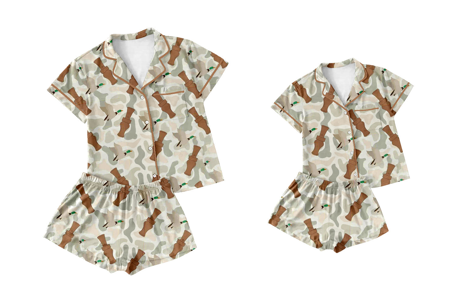 Baby Girl Toddler Adult Women Short Sleeves Ducks Camo Hunting Shorts Sibling Family Shorts Pajamas Set ( Moq 5 Each Style ) 12.16
