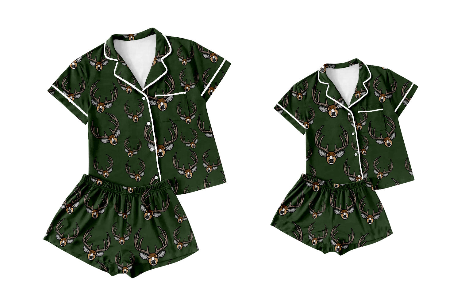 Baby Girl Toddler Adult Women Short Sleeves Deer Green Sibling Family Pajamas Set ( Moq 5 Each Style ) 12.16