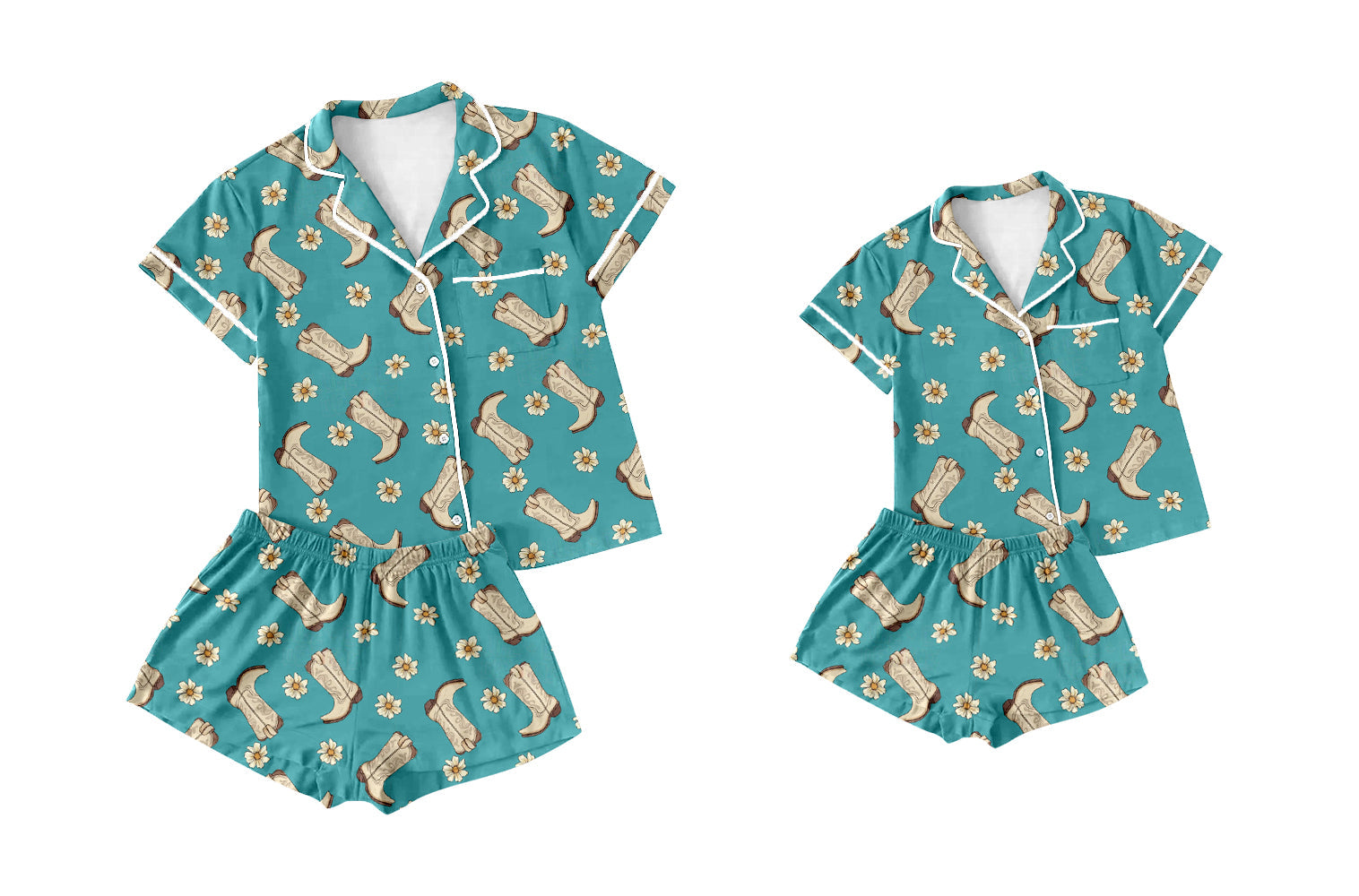 Baby Girl Toddler Adult Women Short Sleeves Western Boots Flower Shorts Sibling Family Shorts Pajamas Set ( Moq 5 Each Style ) 12.18