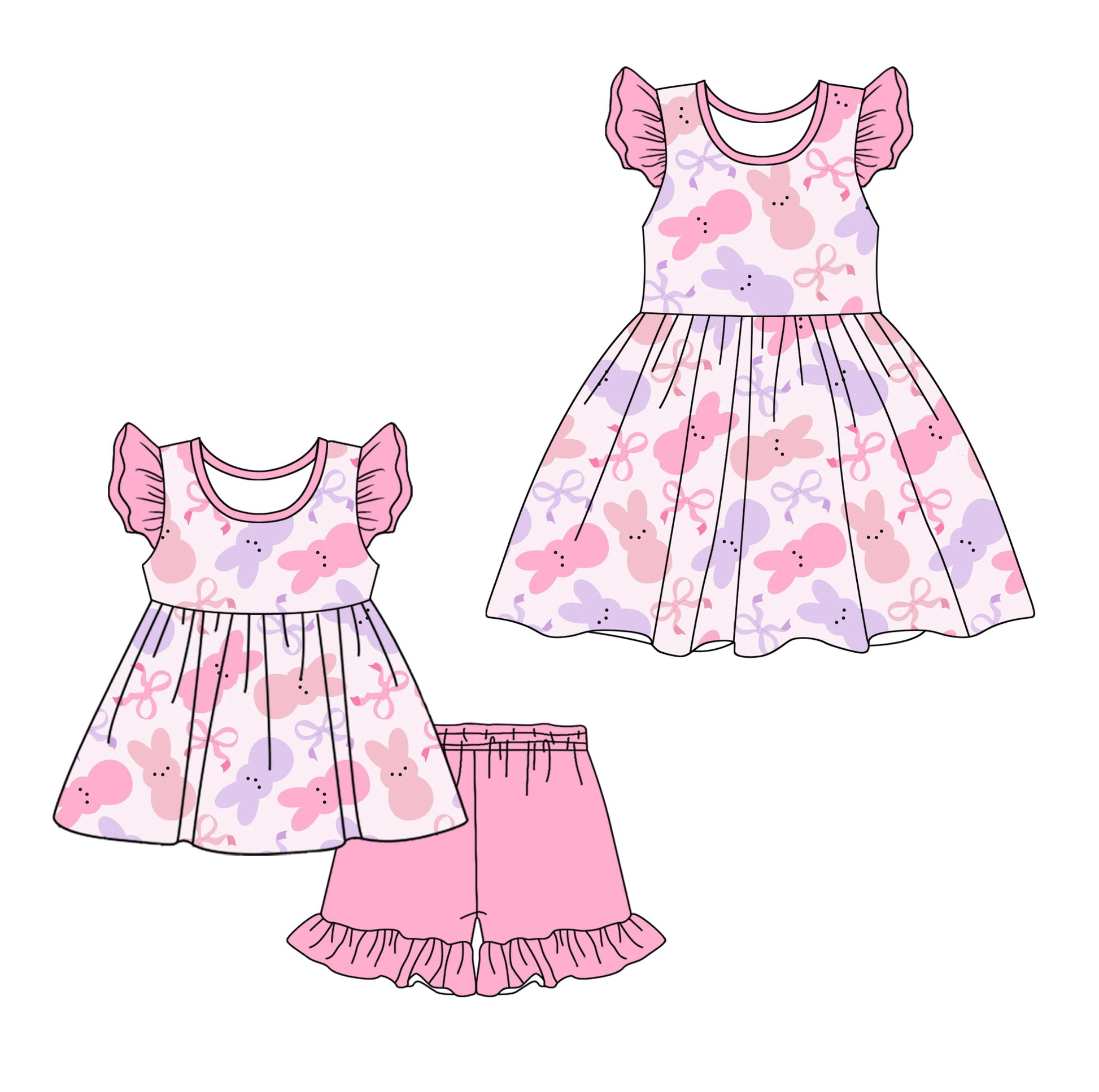 Baby Girl Short Sleeves Easter Rabbits Bows Sibling Dress Clothes Set ( Moq 5 Each Design ) 12.7