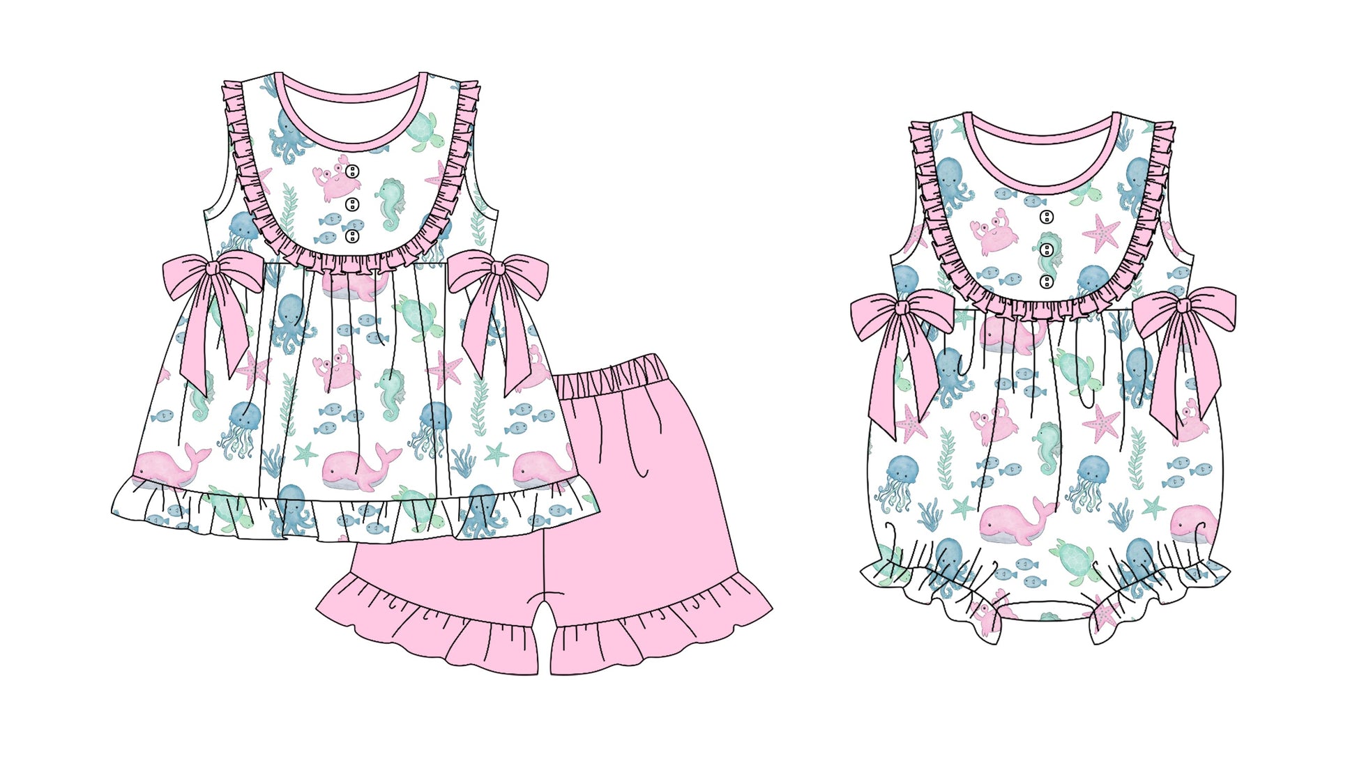 ( Moq 5 Each Style ) Baby Girl Sea Animals Bows Sibling Romper Set 3.25