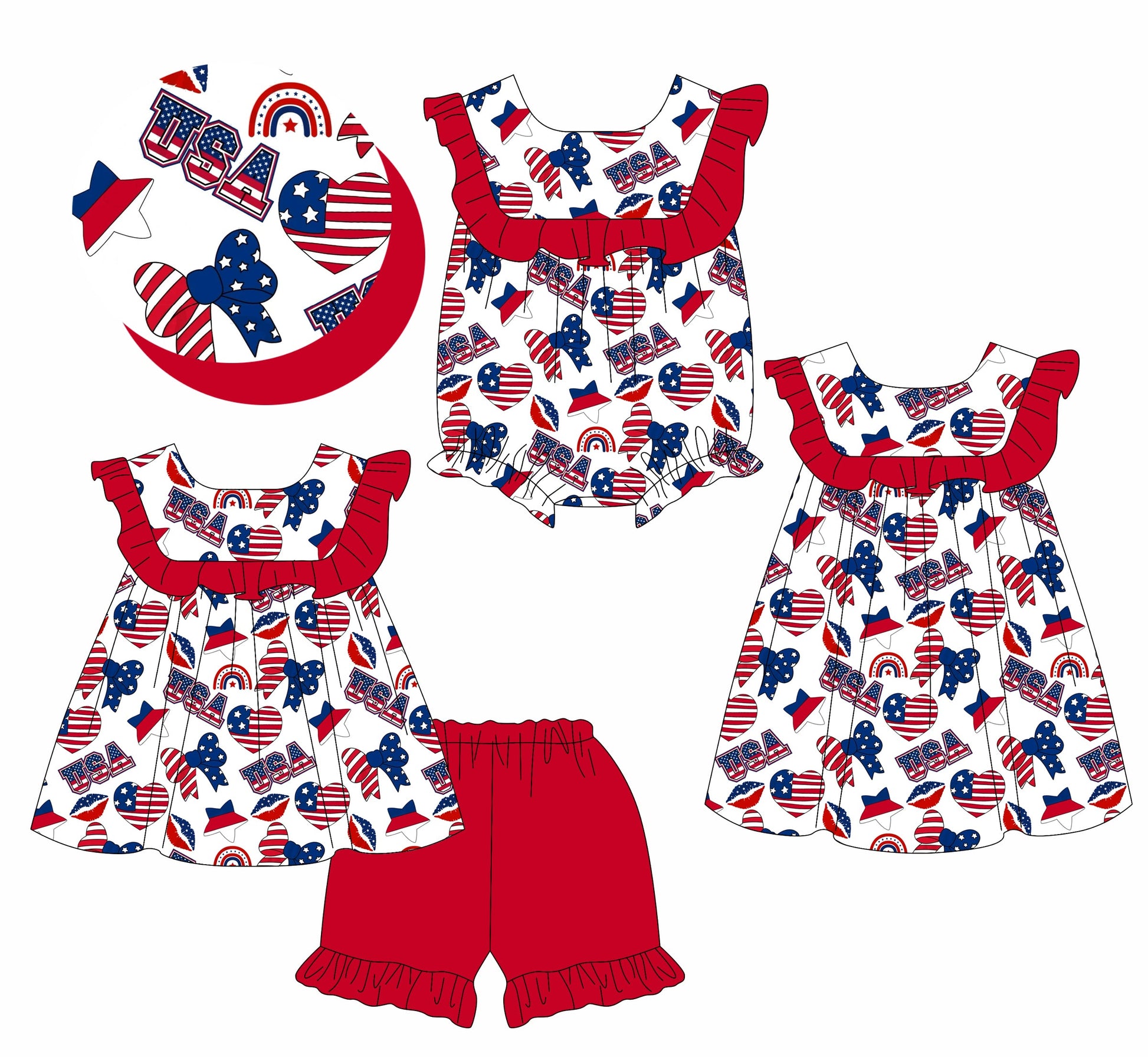 ( Moq 5 Each Style ) Baby Girl Hearts Stars Bows 4th Of July Sibling Romper Dress Set 3.25