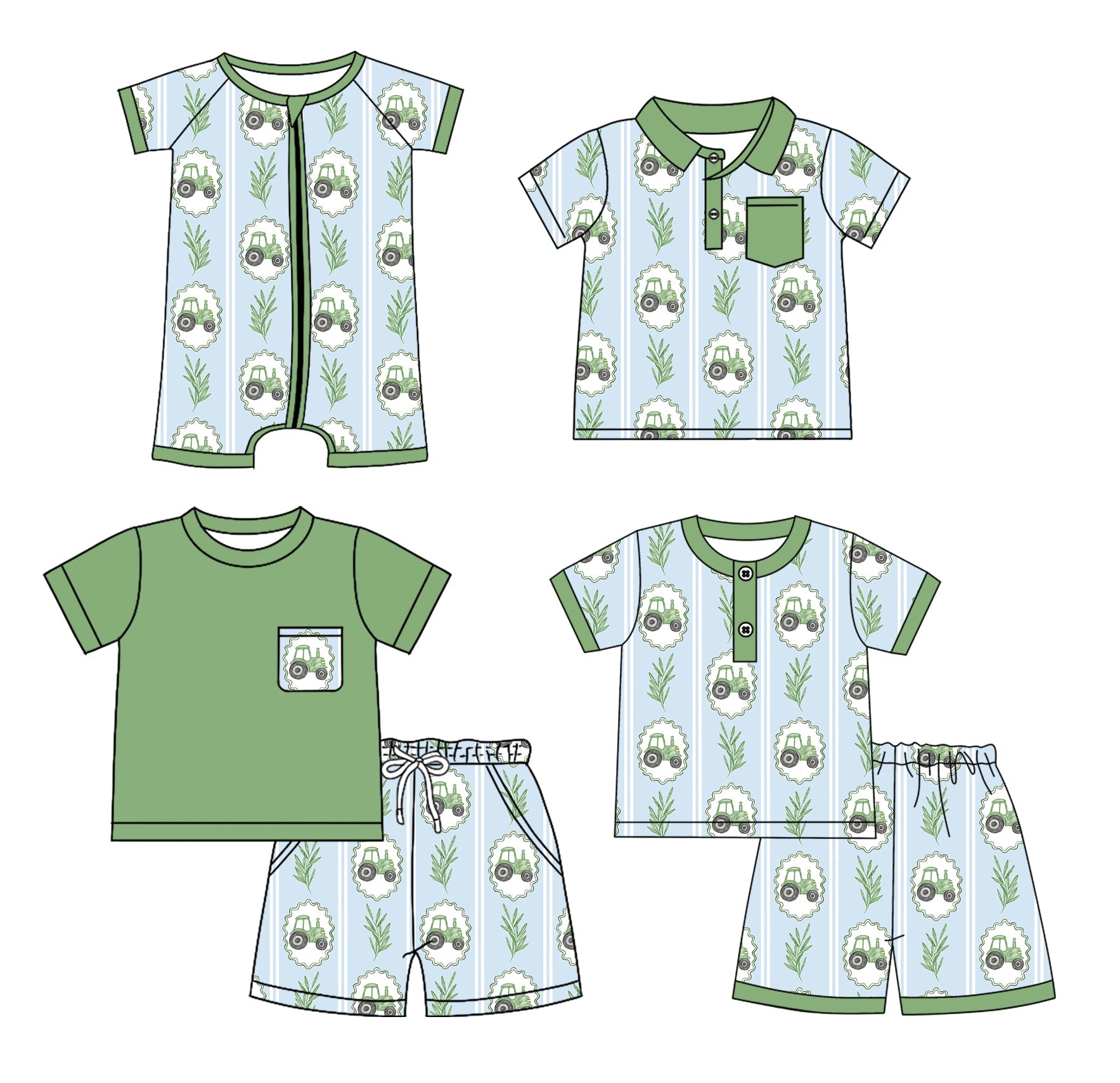 Baby Boy Short Sleeves Tractors Green Sibling Romper Shirt Set ( Moq 5 Each Style ) 3.7