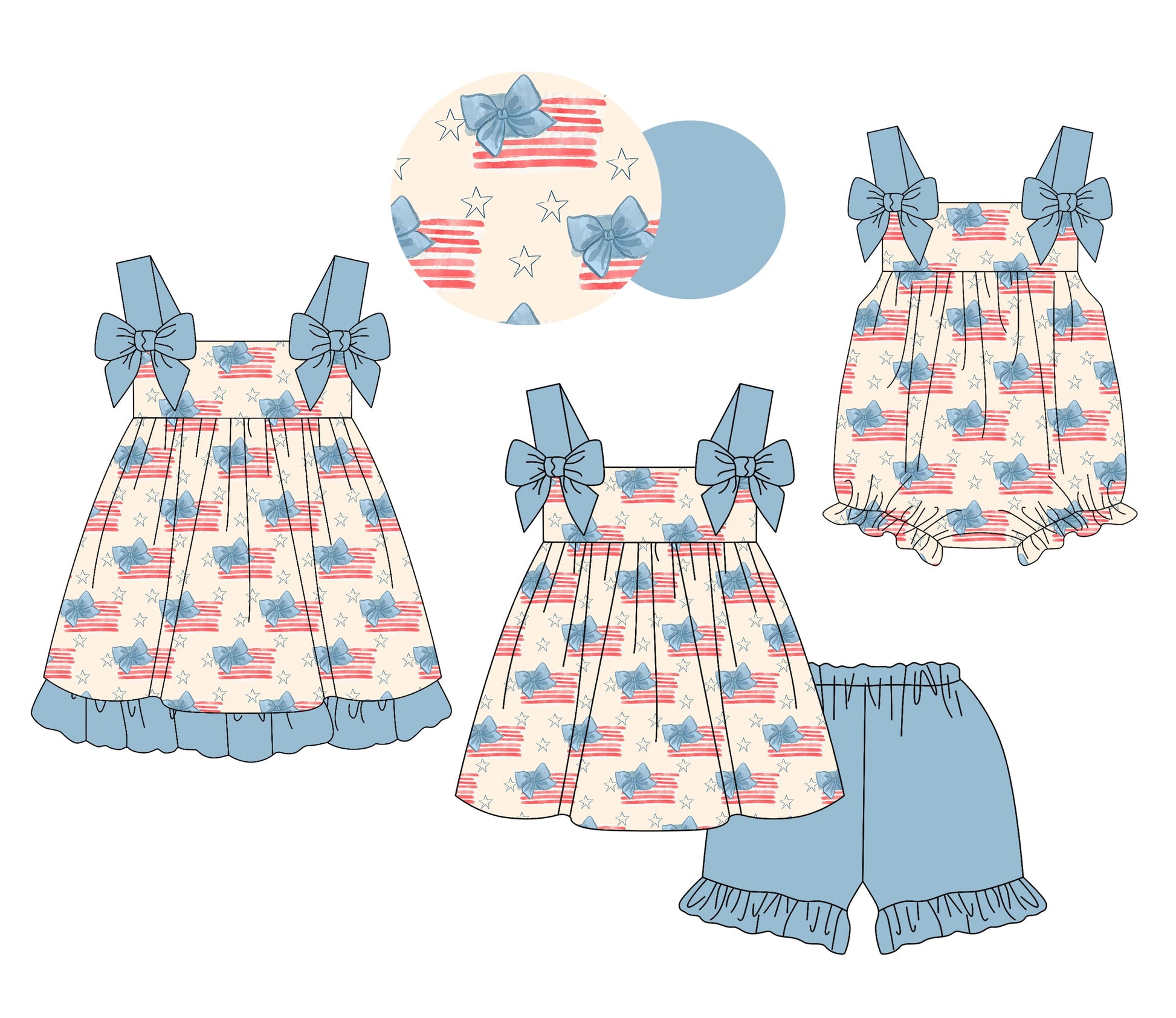 ( Moq 5 Each Style ) Baby Girl Sleeveless Flags Bows 4th Of July Sibling Romper Dress Set 4.19