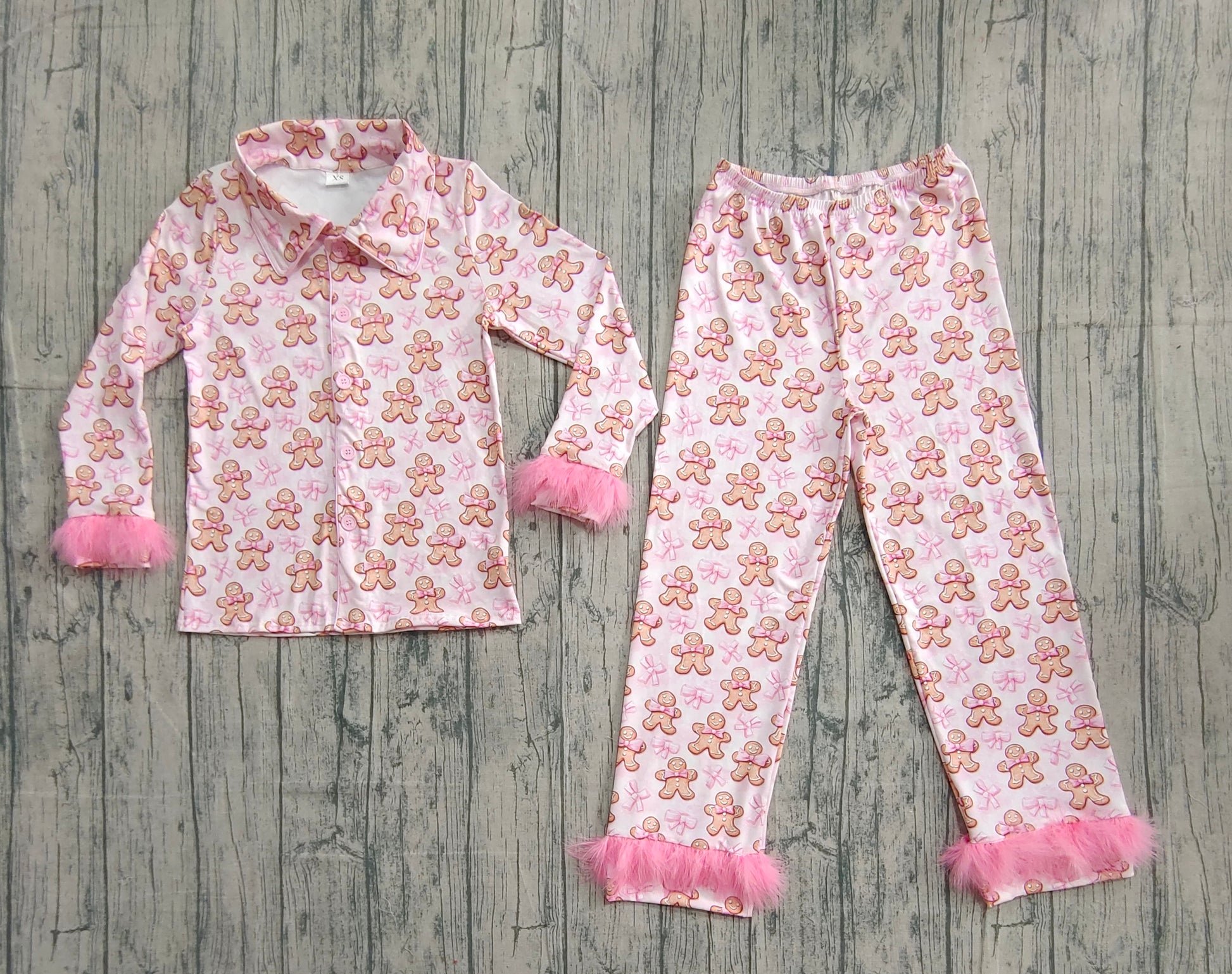 Adult Woman Pink Fur Long Sleeves Gingerbread Bows Buttons Shirt Pants Christmas Pajamas Set RTS