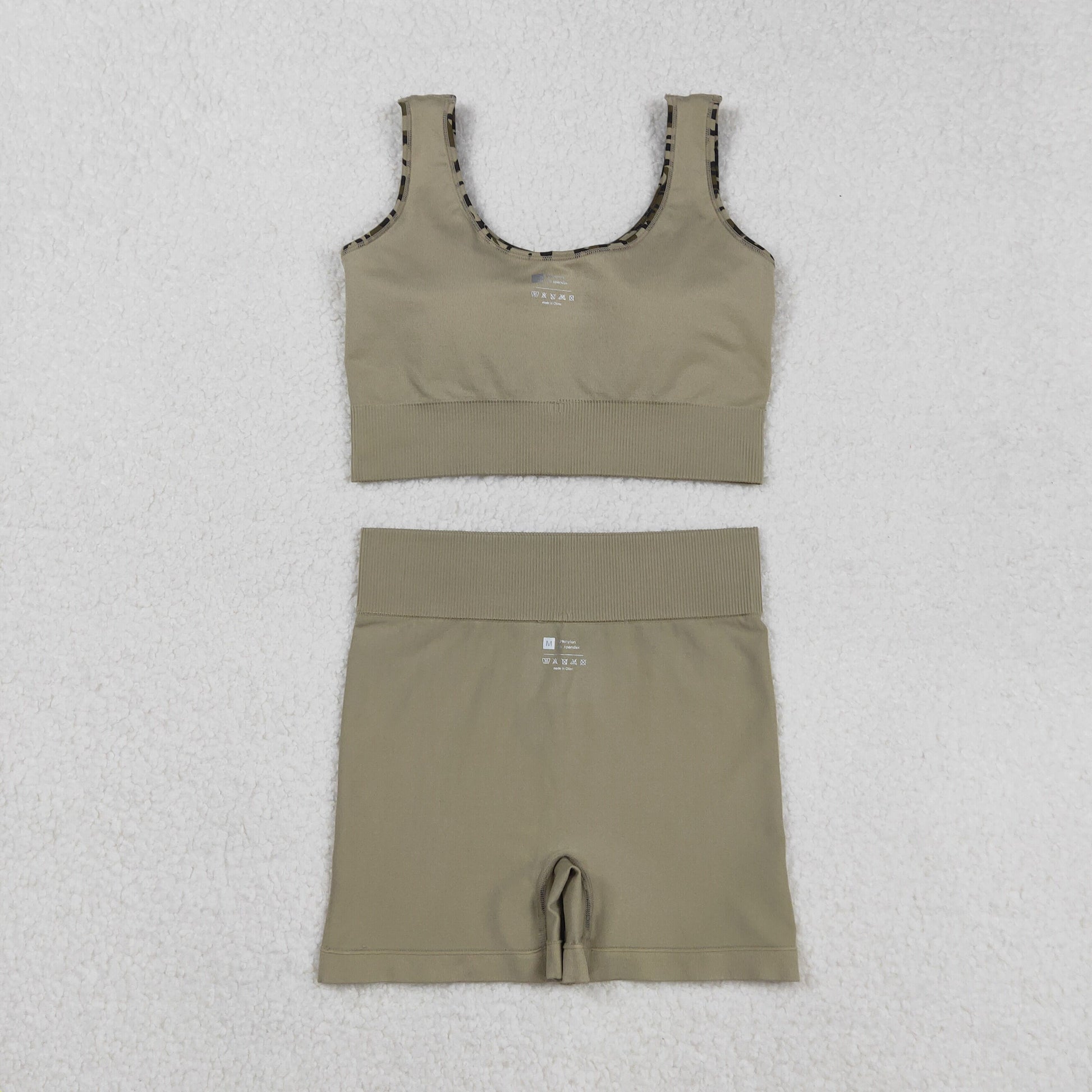 Adult Woman Sleeveless Green Camo Tank Tops Shorts Knitted Yoga Set RTS