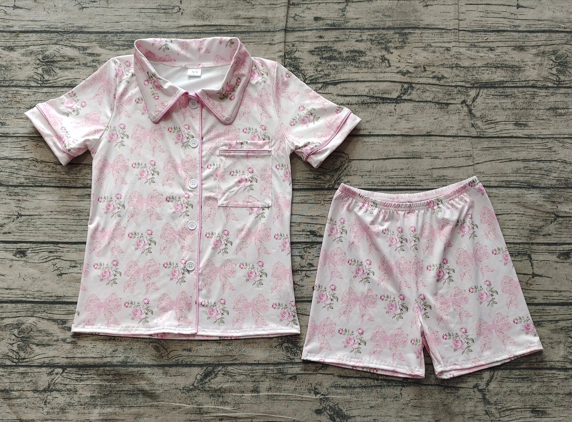 Adult Women Short Sleeves Bows Flower Buttons Shirt Shorts Pajamas Pink Set RTS