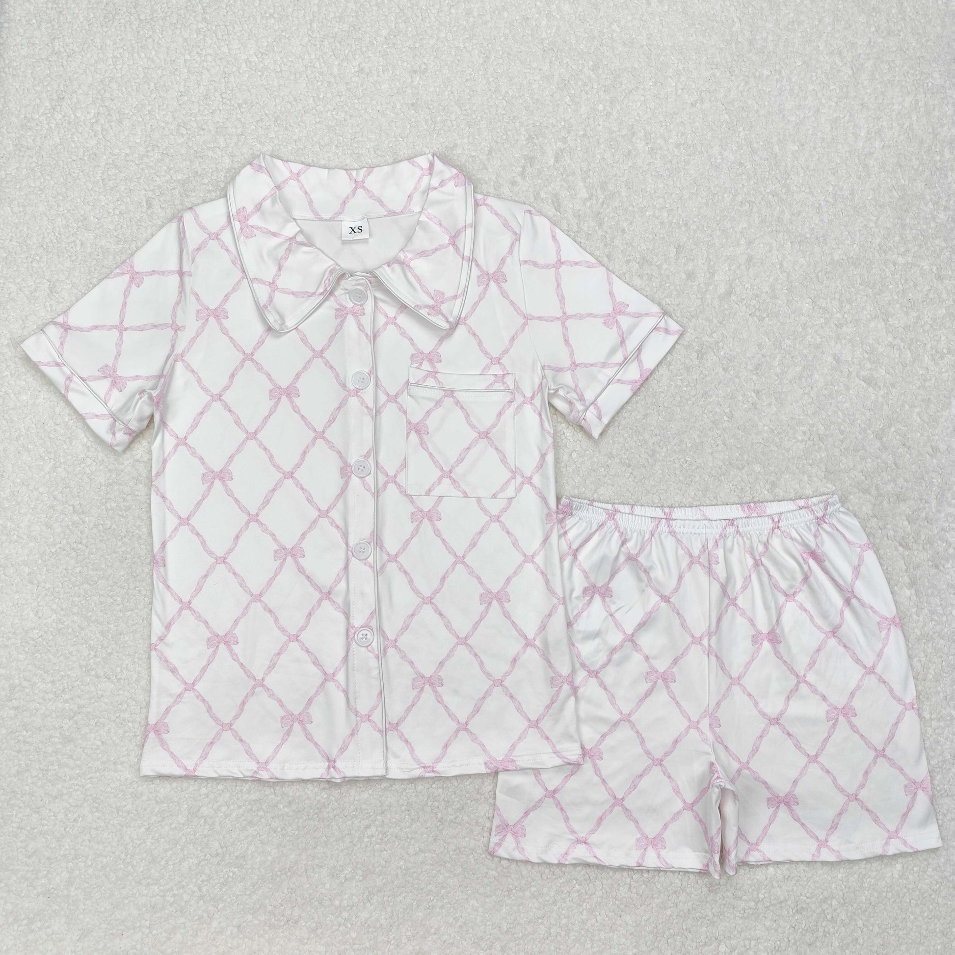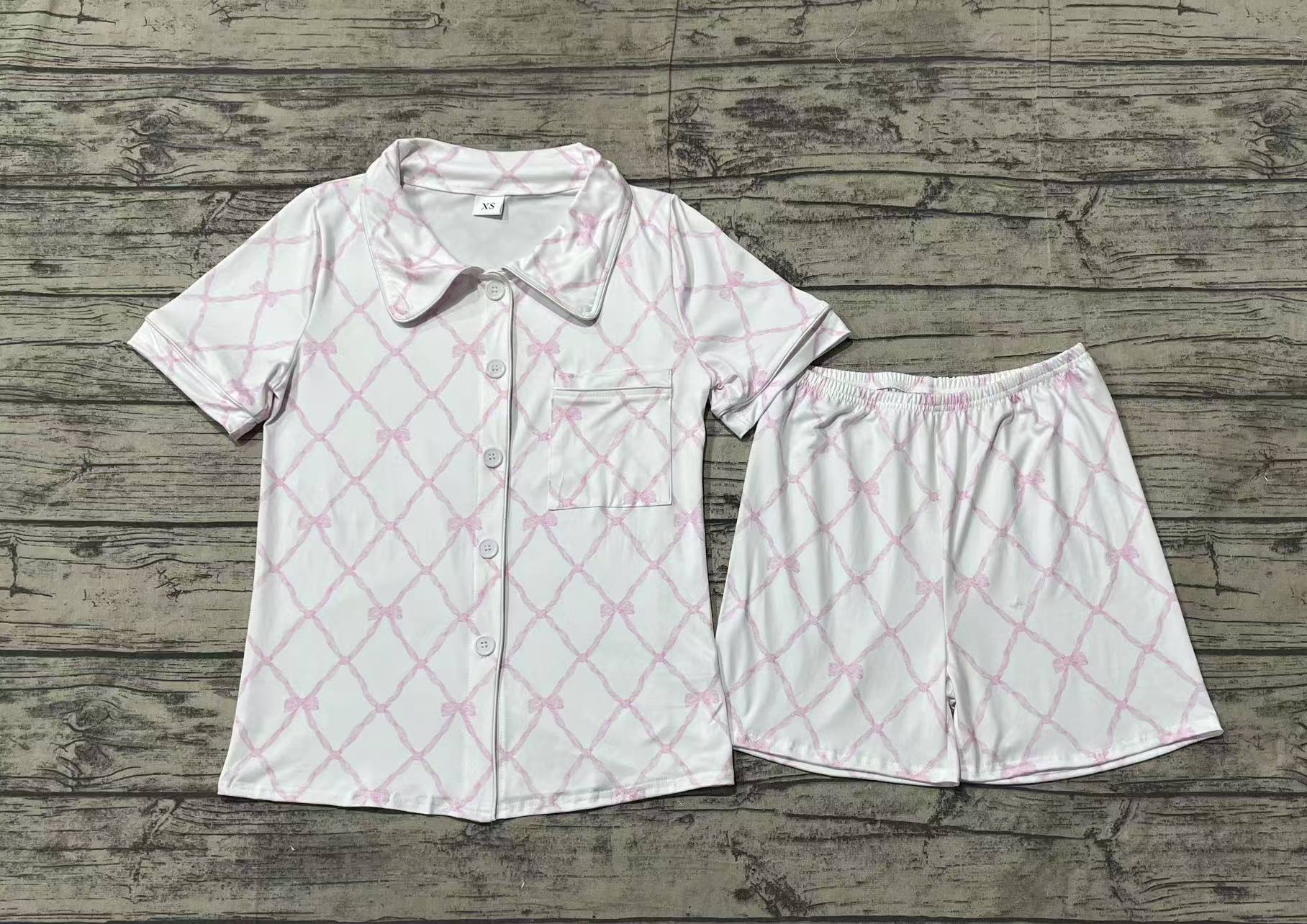 Adult Women Short Sleeves Pink Bows Buttons Shirt Shorts Pajamas Set