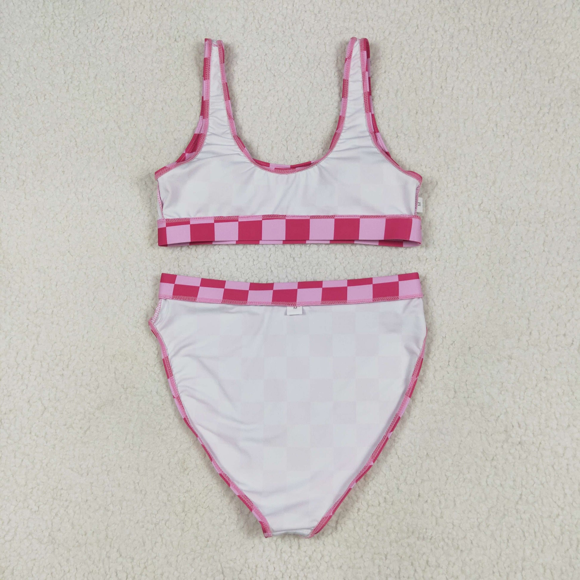 Adult Women Sleeveless Pink Plaid Tops Shorts Swimsuit Set RTS