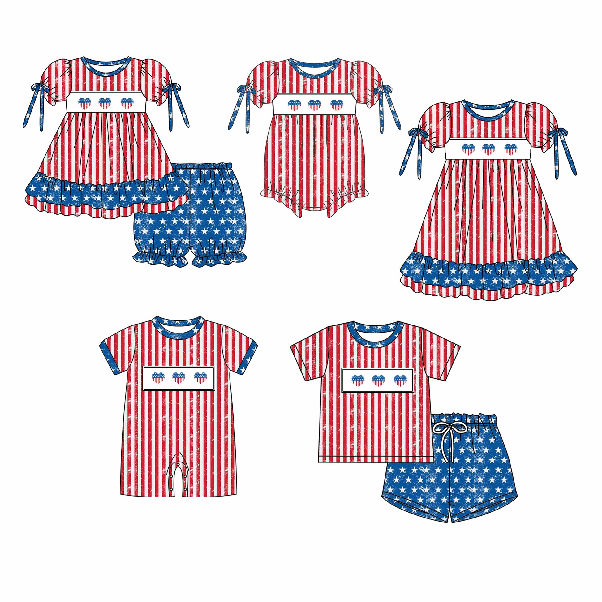 Baby Boy Girl July 4th Hearts Stars Stripes Sibling Dress Romper Clothes Set ( Moq 5 Each style ) 11.26