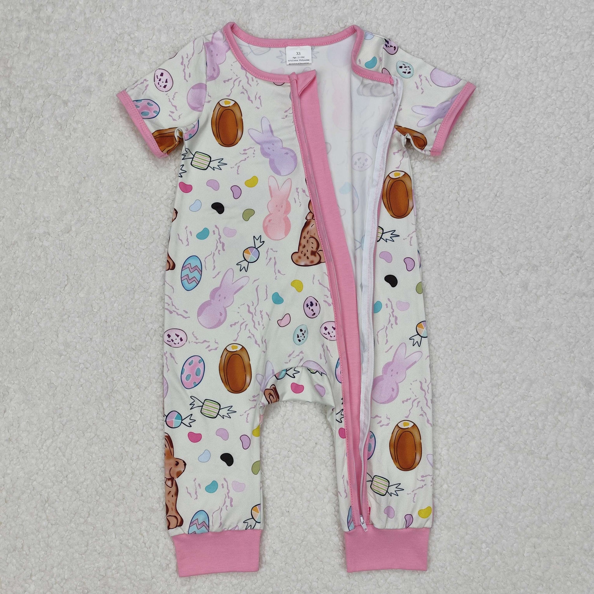 Baby Boy Infant Short Sleeves Easter Rabbits Zipper Blue Romper