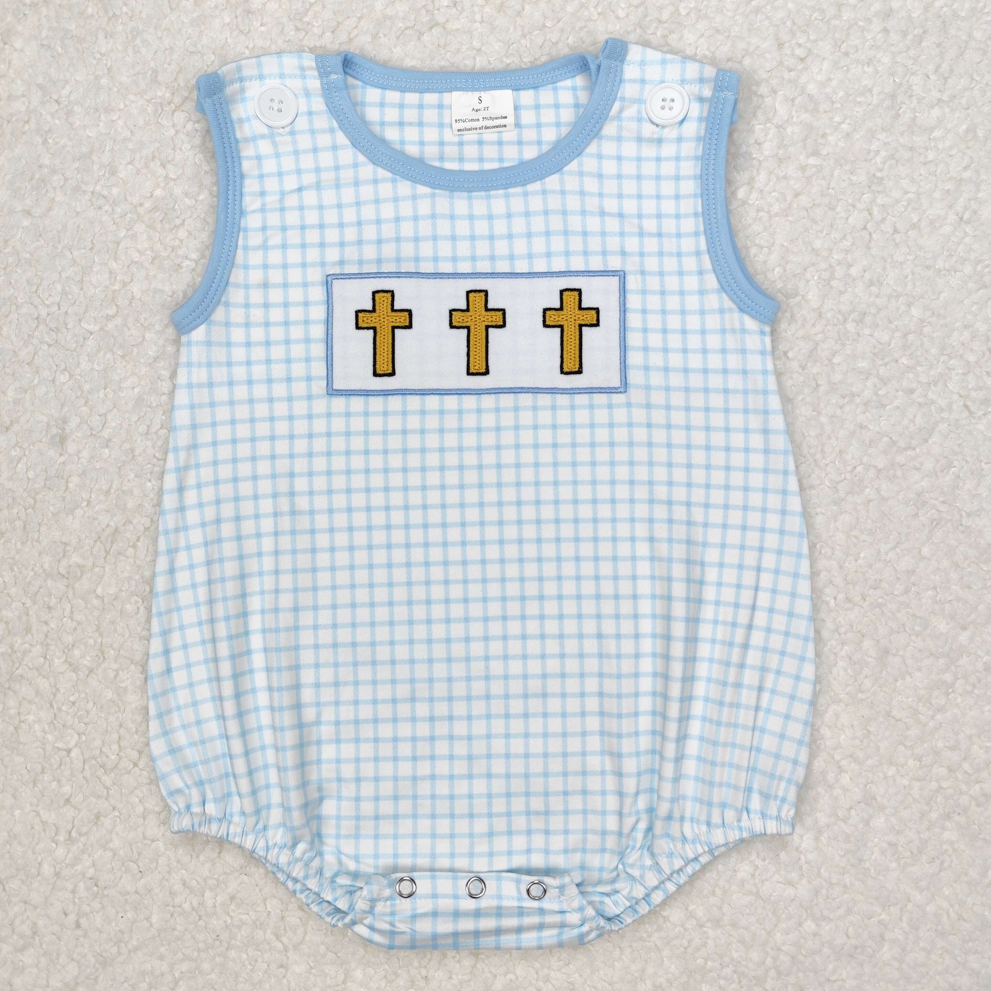 Baby Boy Infant Sleeveless Blue Plaid Embroidery Easter Cross Bubble Romper RTS