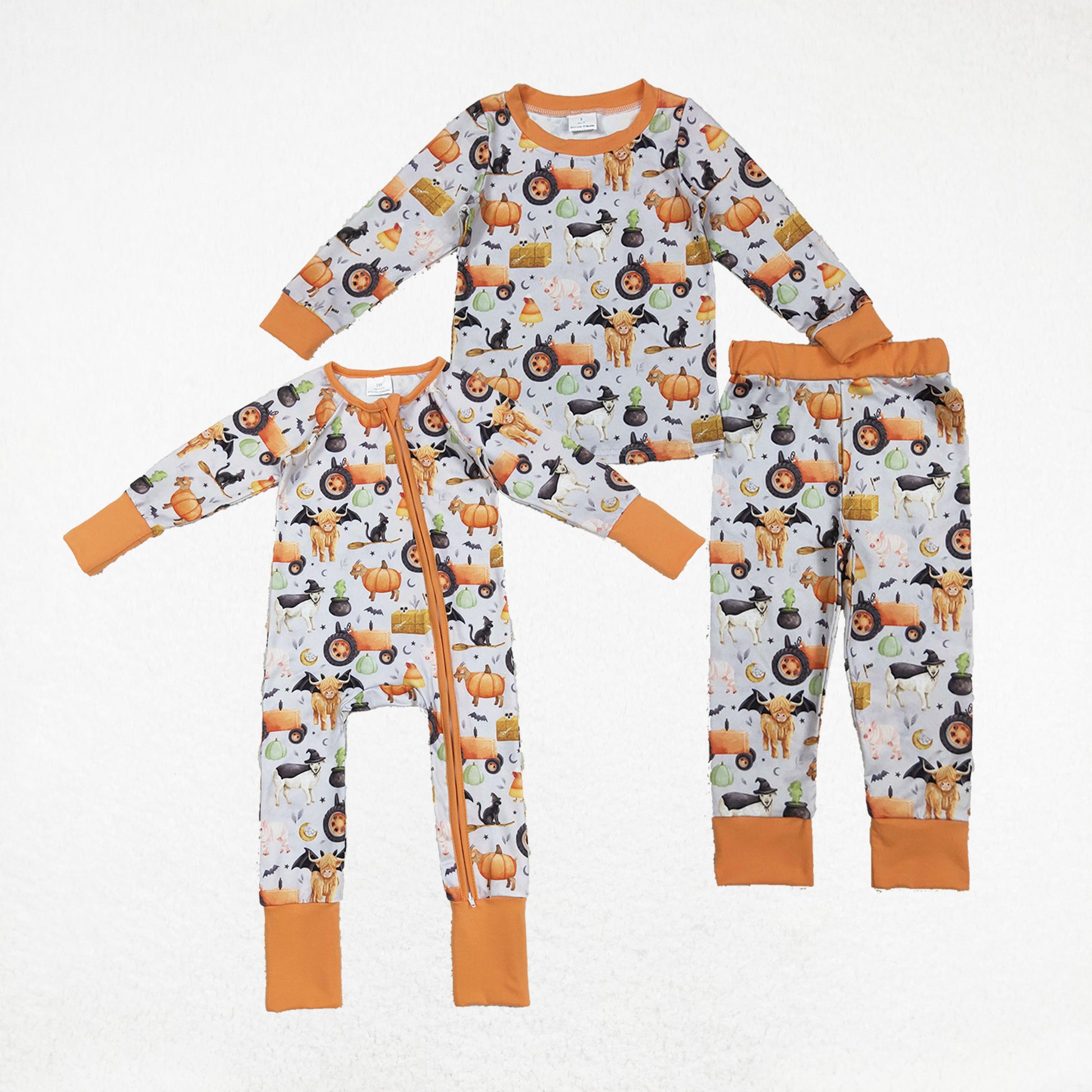 Baby Boy Long Sleeves Pumpkins Farm Animals Sibling Halloween Pajamas Zipper Romper Set