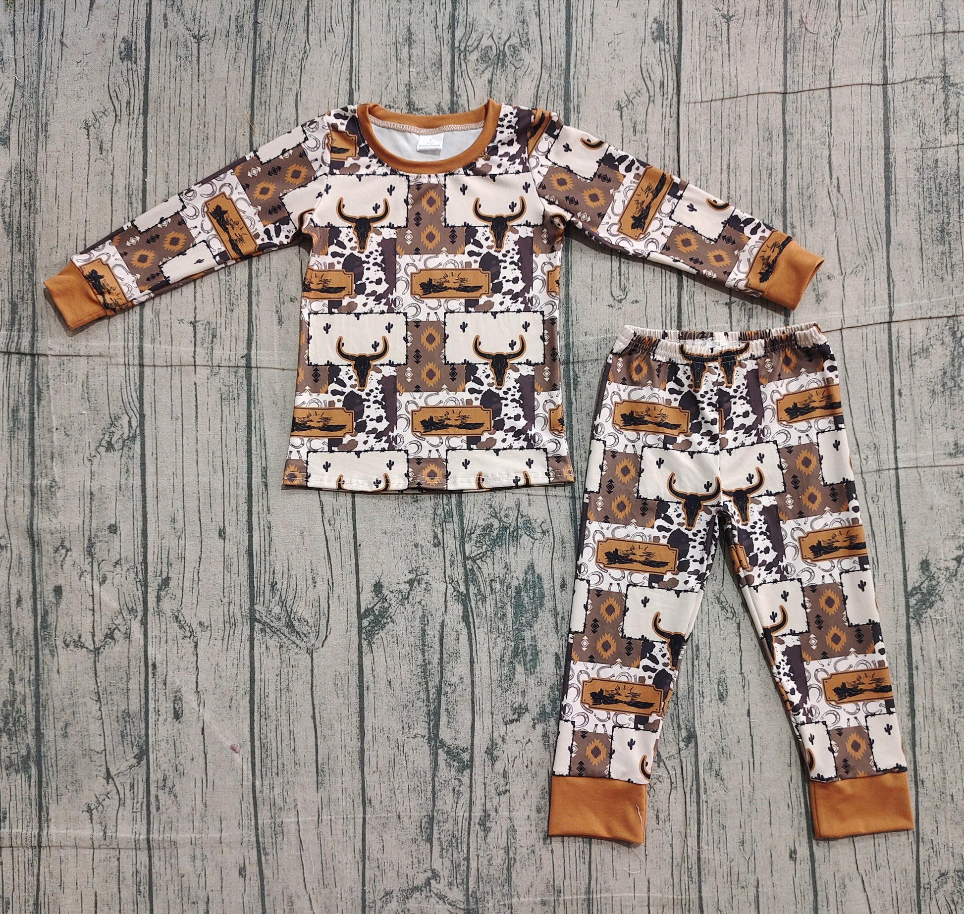Baby Boy Long Sleeves Western Cow Cactus Shirt Pants Brown Pajamas Clothes Set RTS