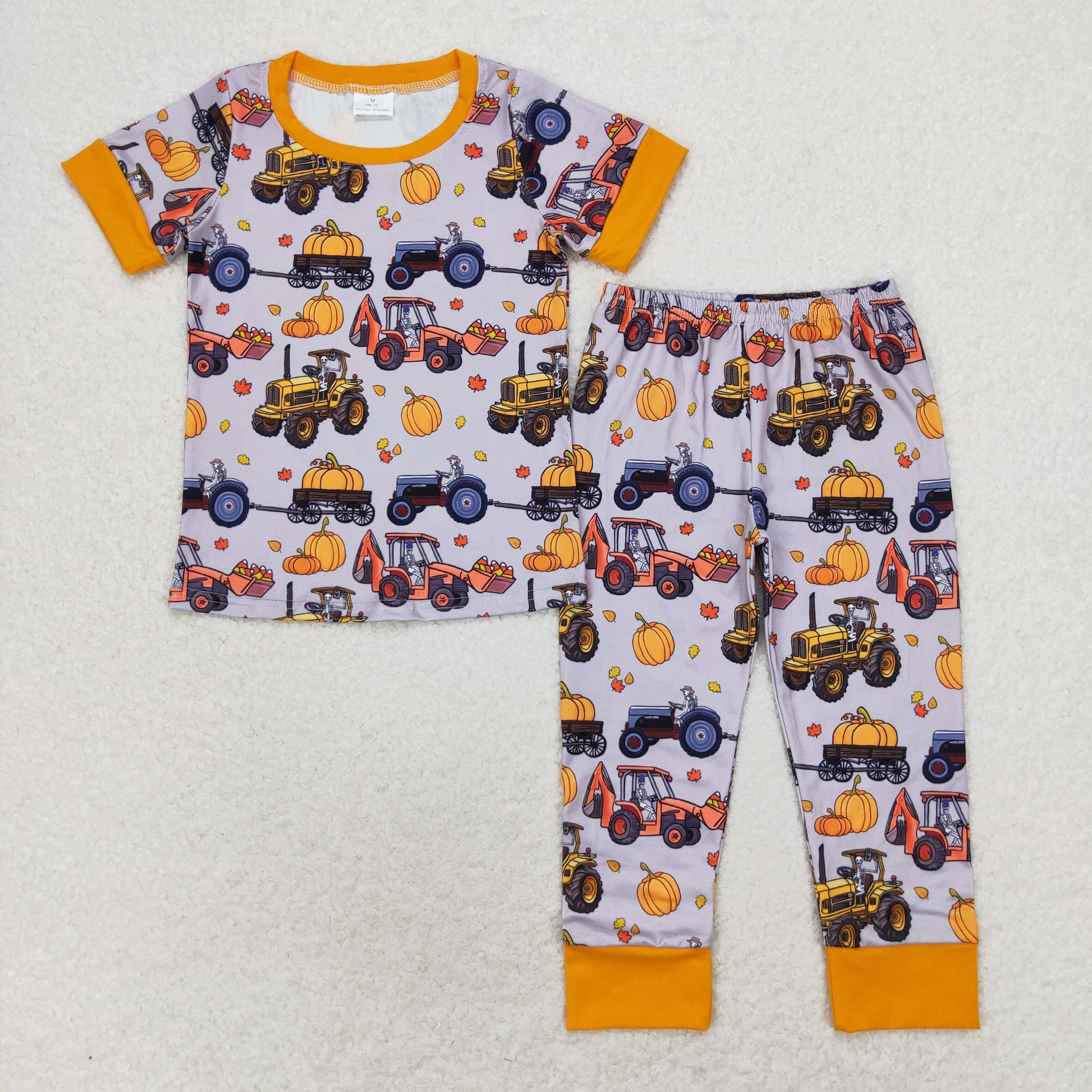 Baby Boy Short Sleeves Pumpkin Tractors Shirt Pants Pajamas Halloween Set