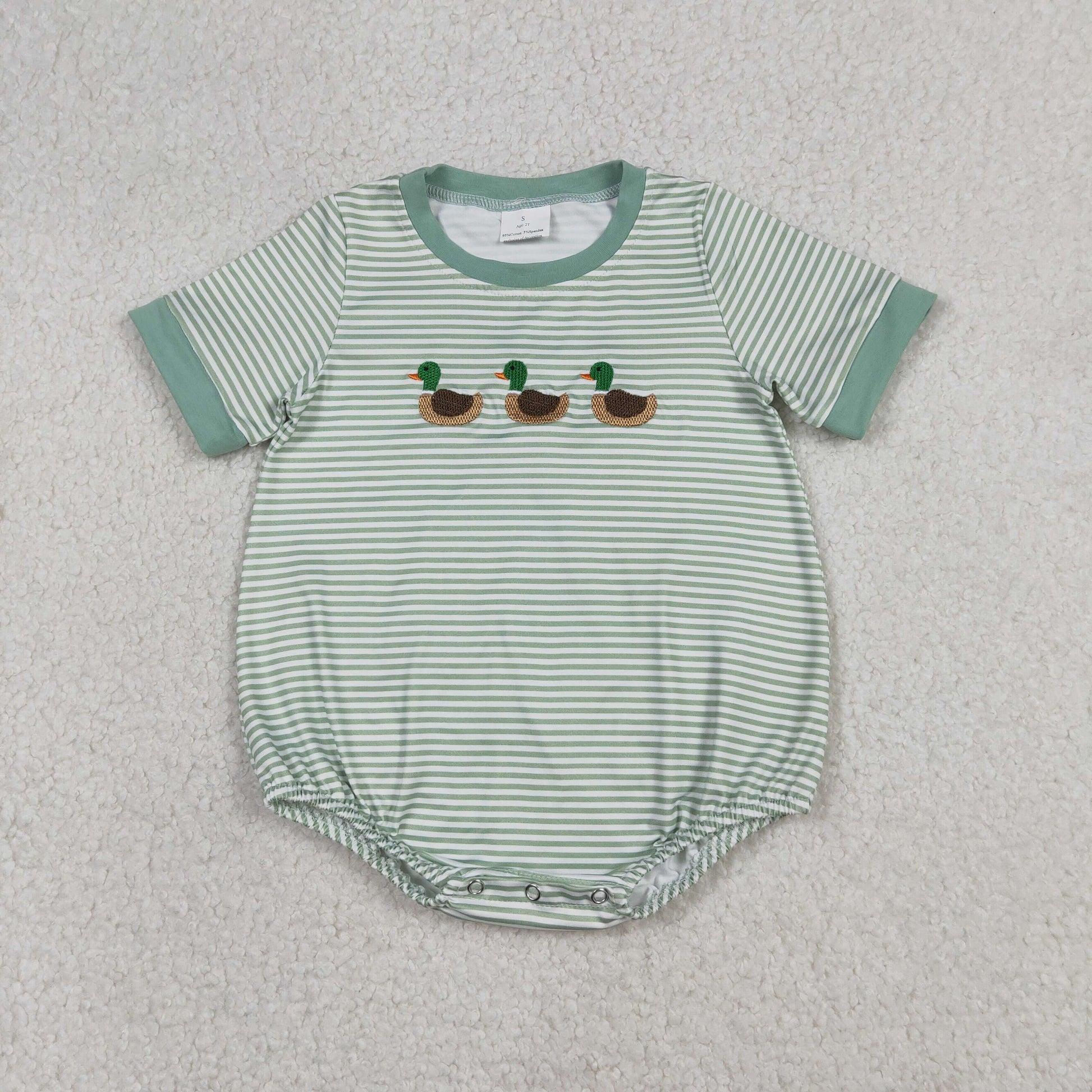 Baby Boys Infant Short Sleeves Embroidery Ducks Green Stripes Bubble Romper