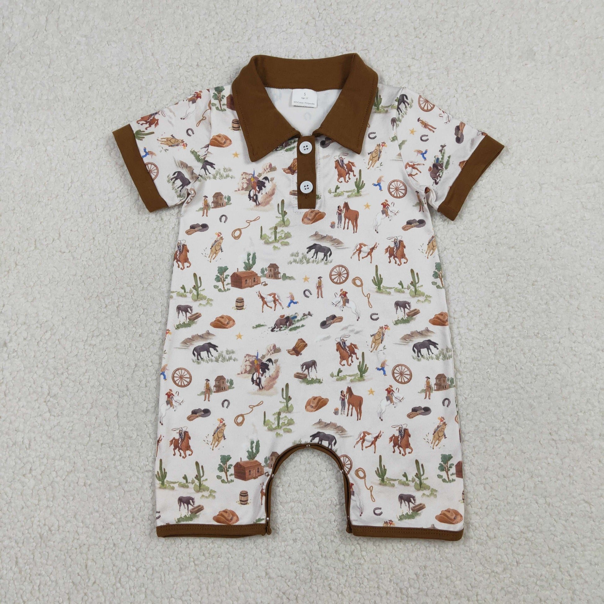 Baby Boys Kids Short Sleeves Western Rodeo Cactus Buttons Brown Romper RTS
