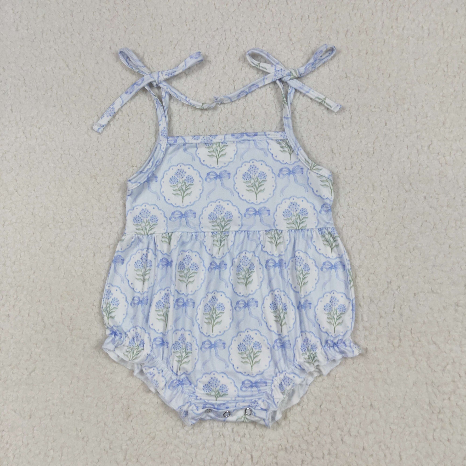 Baby Girl Blue Straps Bows Flower Ruffle Bubble Romper RTS