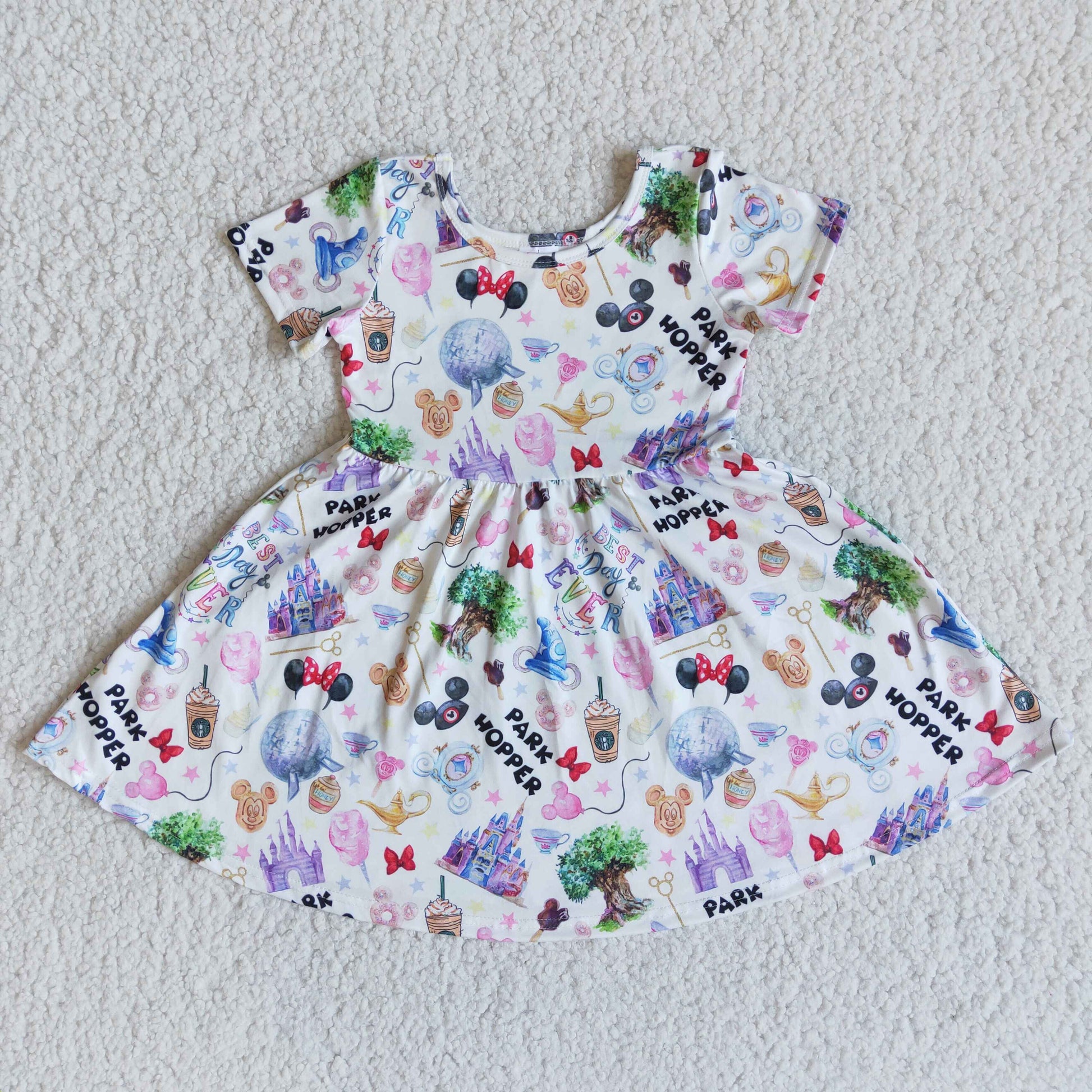 E11-1 Baby Girl Short Sleeves Castle Cartoon Twirl Dress
