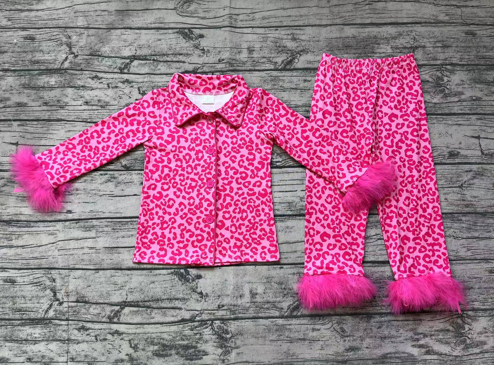 Baby Girl Dark Pink Leopard Buttons Top Pants Pajamas Set