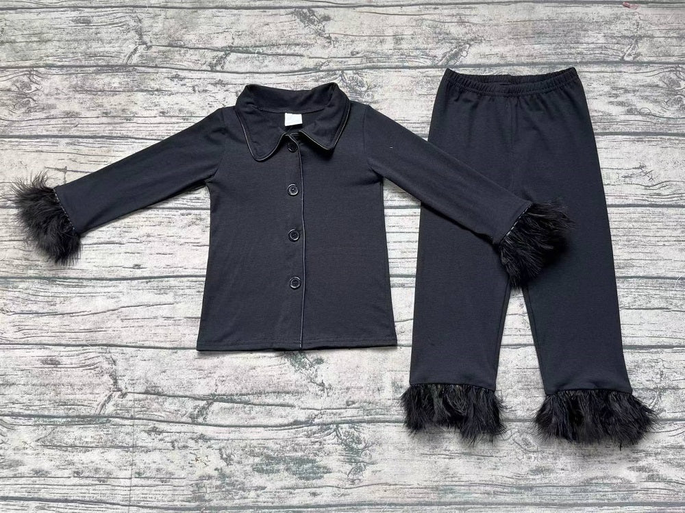 Baby Girl Fur Long Sleeves Black Cotton Buttons Shirt Pants Pajamas Set