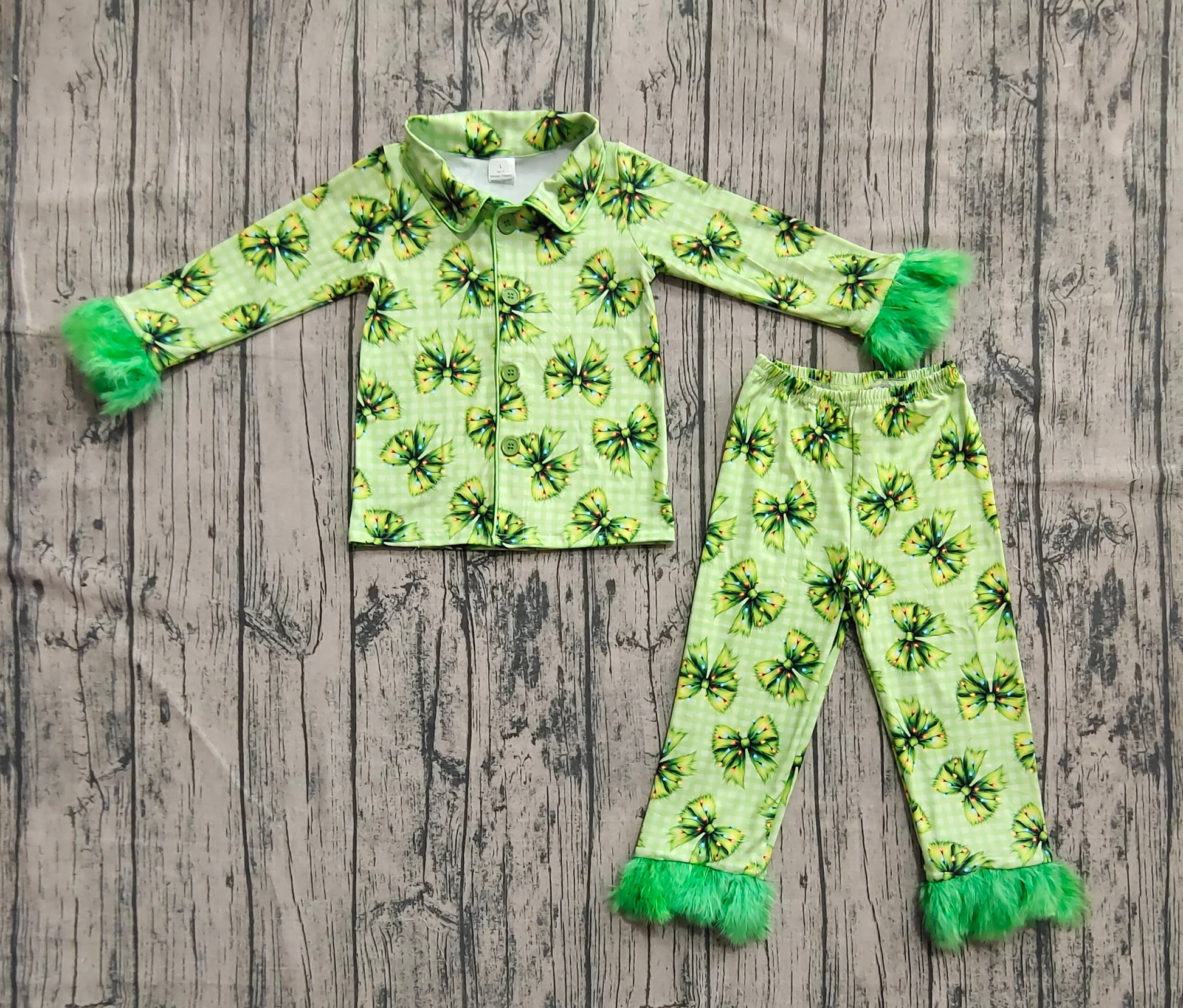 Baby Girl Fur Long Sleeves Bows Green Plaid Buttons Shirt Pants Christmas Pajamas Clothes Set RTS