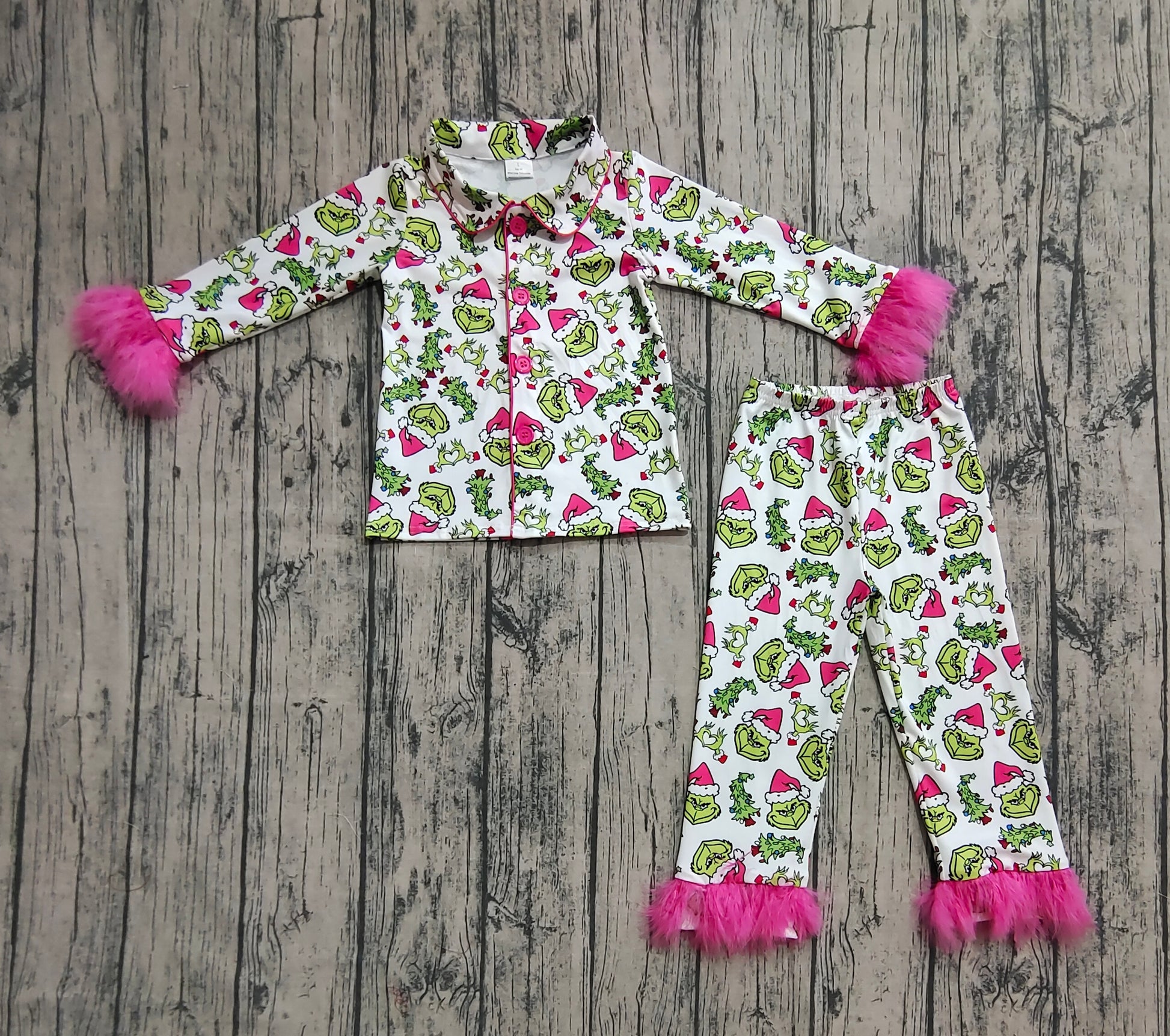 Baby Girl Fur Long Sleeves Green Face Buttons Shirt Pants Christmas Pajamas Set RTS