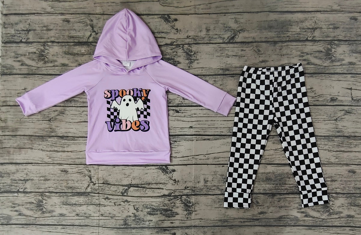 Baby Girl Halloween Spooky Hoodie Purple Tops Checked Pants Set
