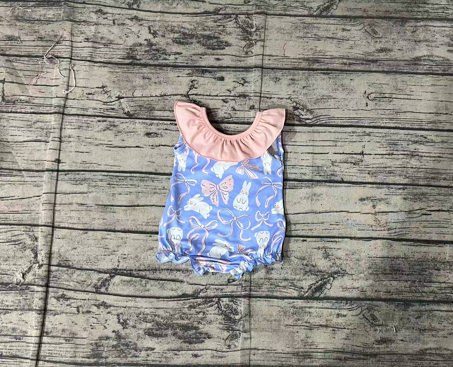 Baby Girl Infant Sleeveless Easter Rabbits Bows Ruffle Bubble Romper RTS