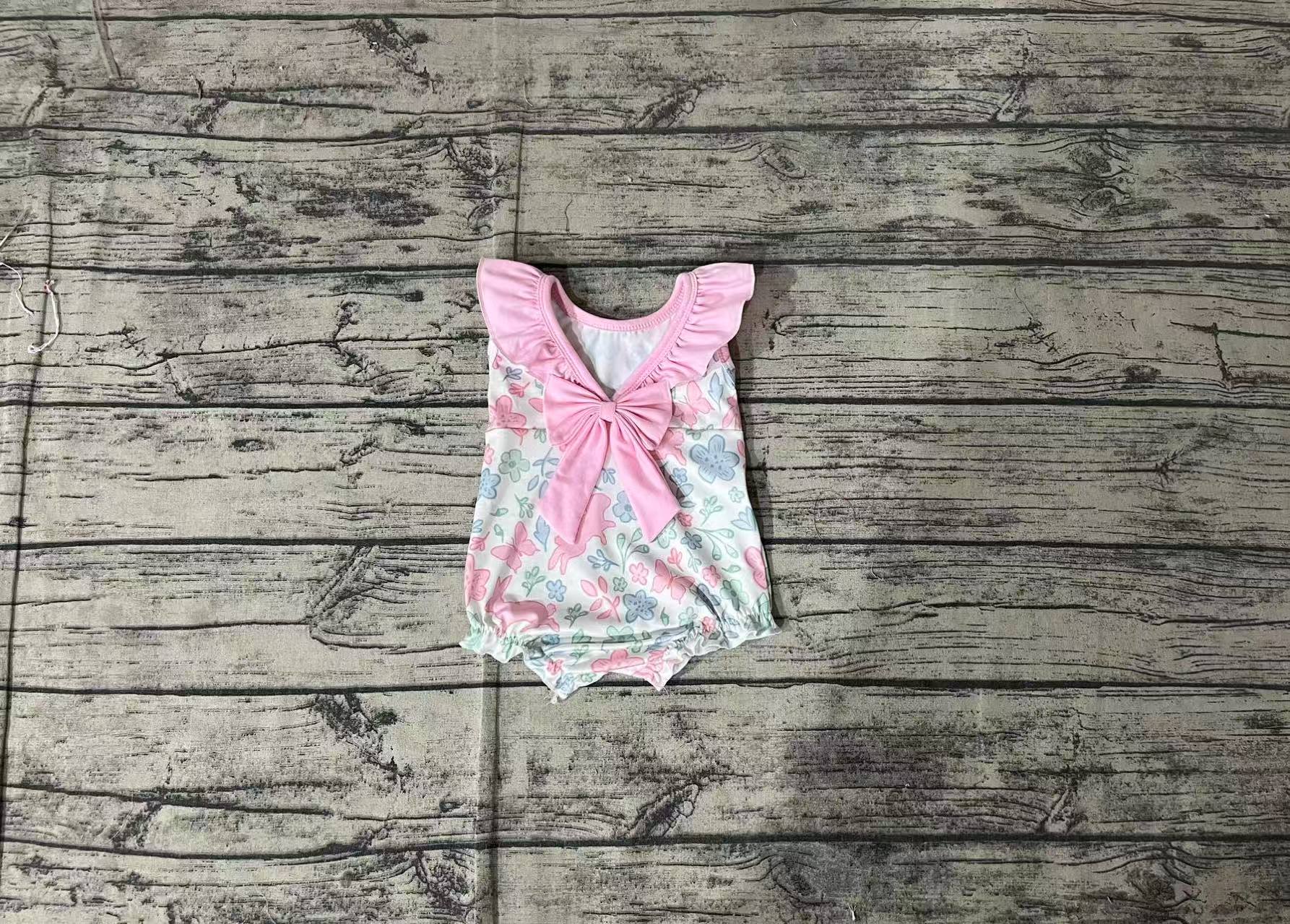 Baby Girl Infant Sleeveless Easter Rabbits Flower Pink Bow Bubble Romper RTS