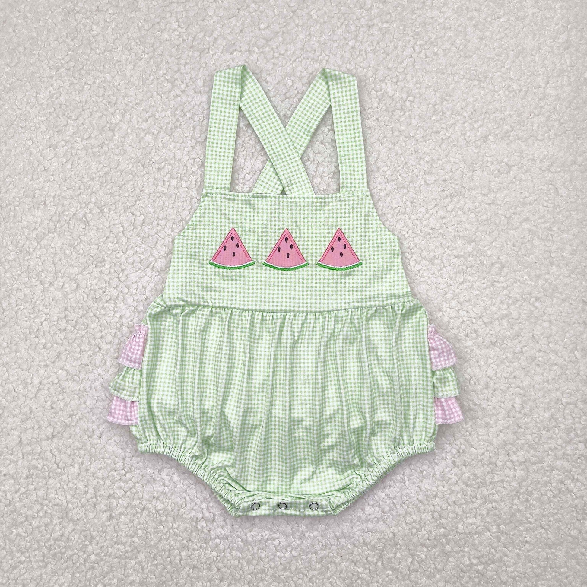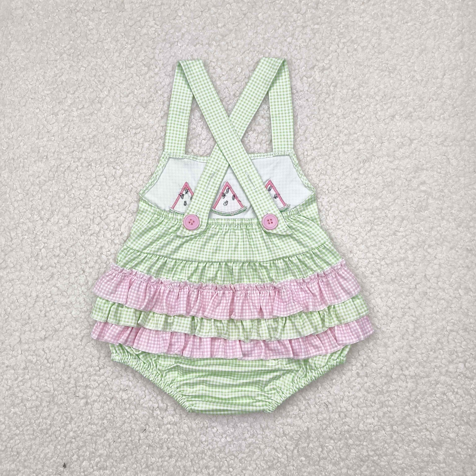 Baby Girl Infant Straps Embroidery Watermelon Green Checked Romper RTS