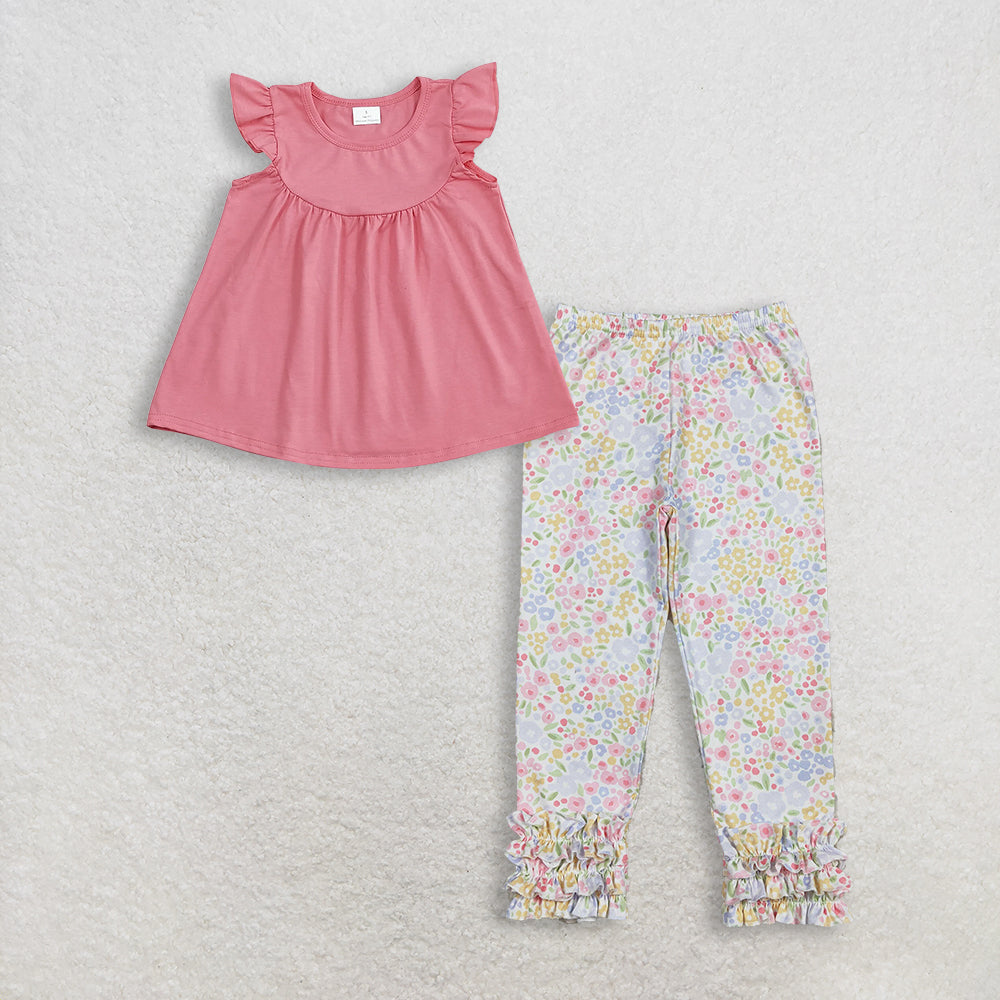 Baby Girl Kids Short Sleeves Cotton Pink Tops Floral Ruffle Pants Set Clothes RTS