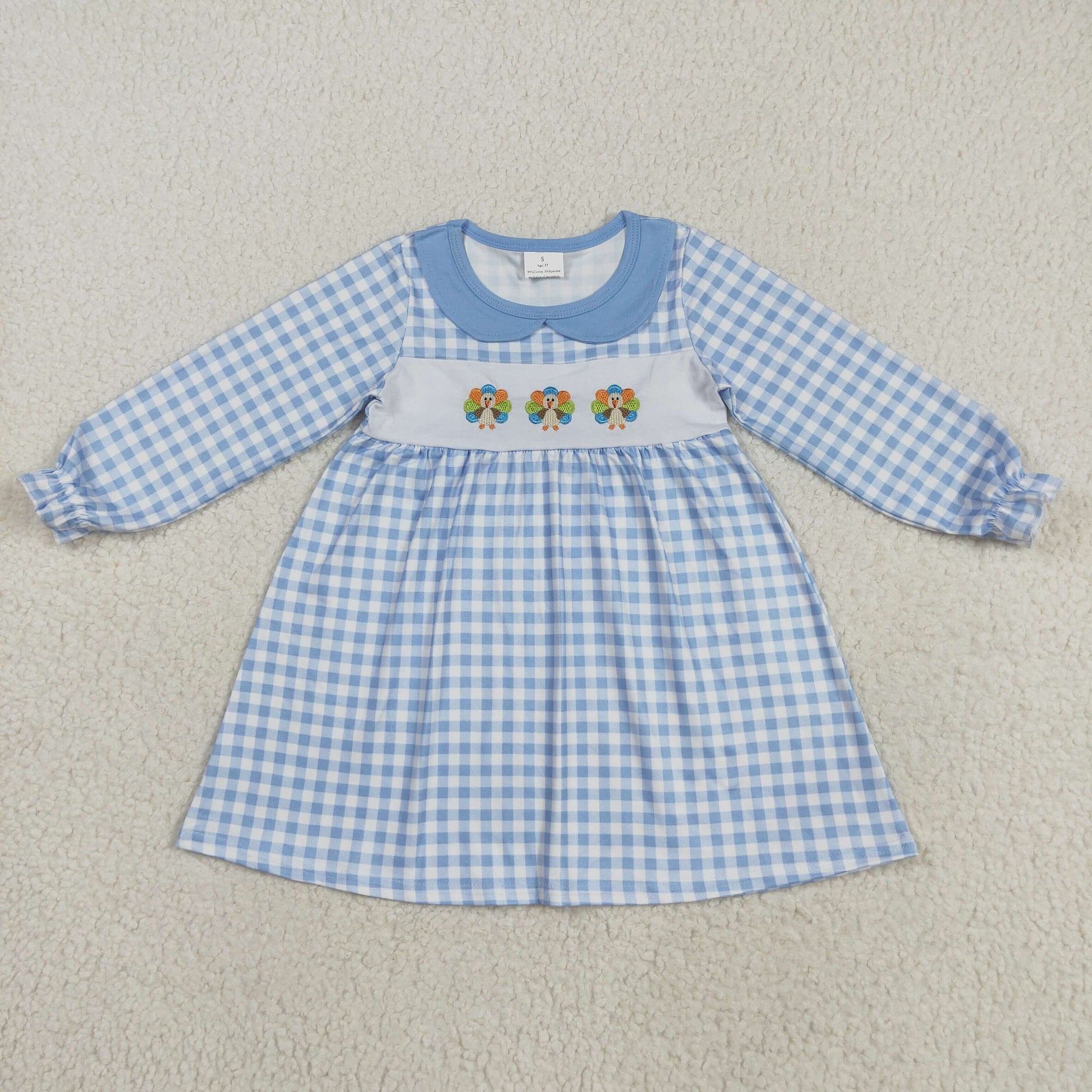 Baby Girl Long Sleeves Blue Plaid Embroidery turkey Knee Length Dress RTS