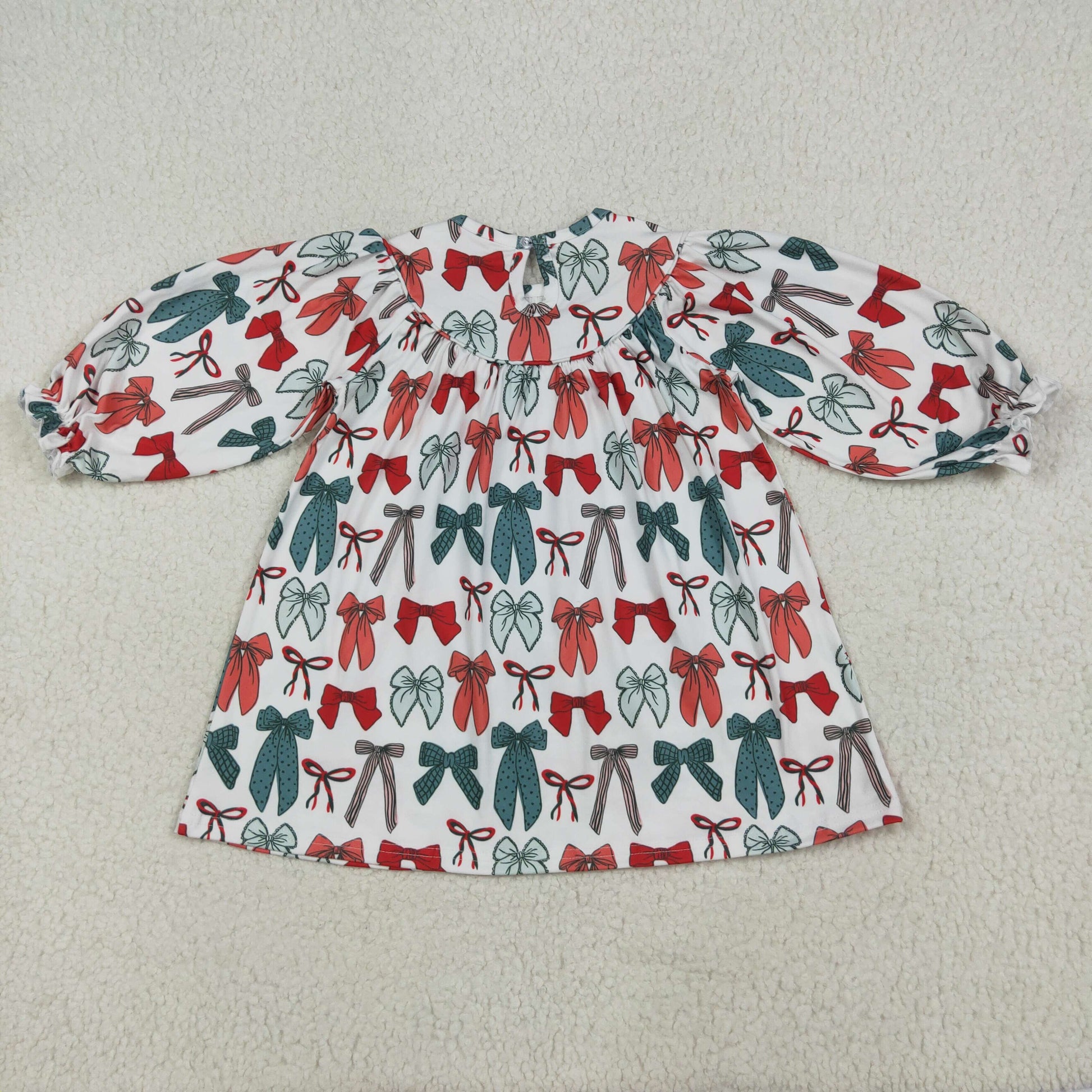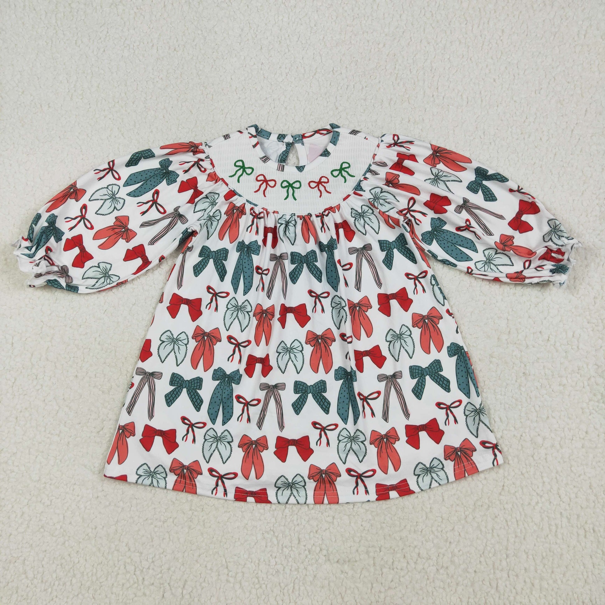 Baby Girl Long Sleeves Christmas Embroidery Bows Knee Length Smocked Dress RTS