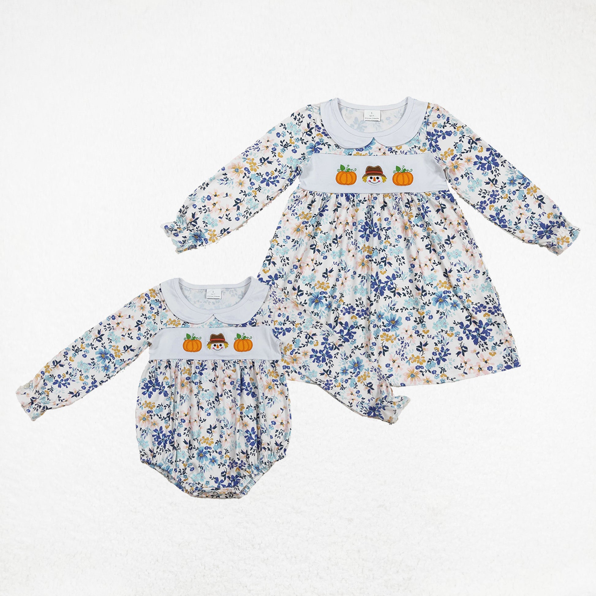 Baby Girl Long Sleeves Floral Embroidery Pumpkins Sibling Thanksgiving Romper Dress RTS