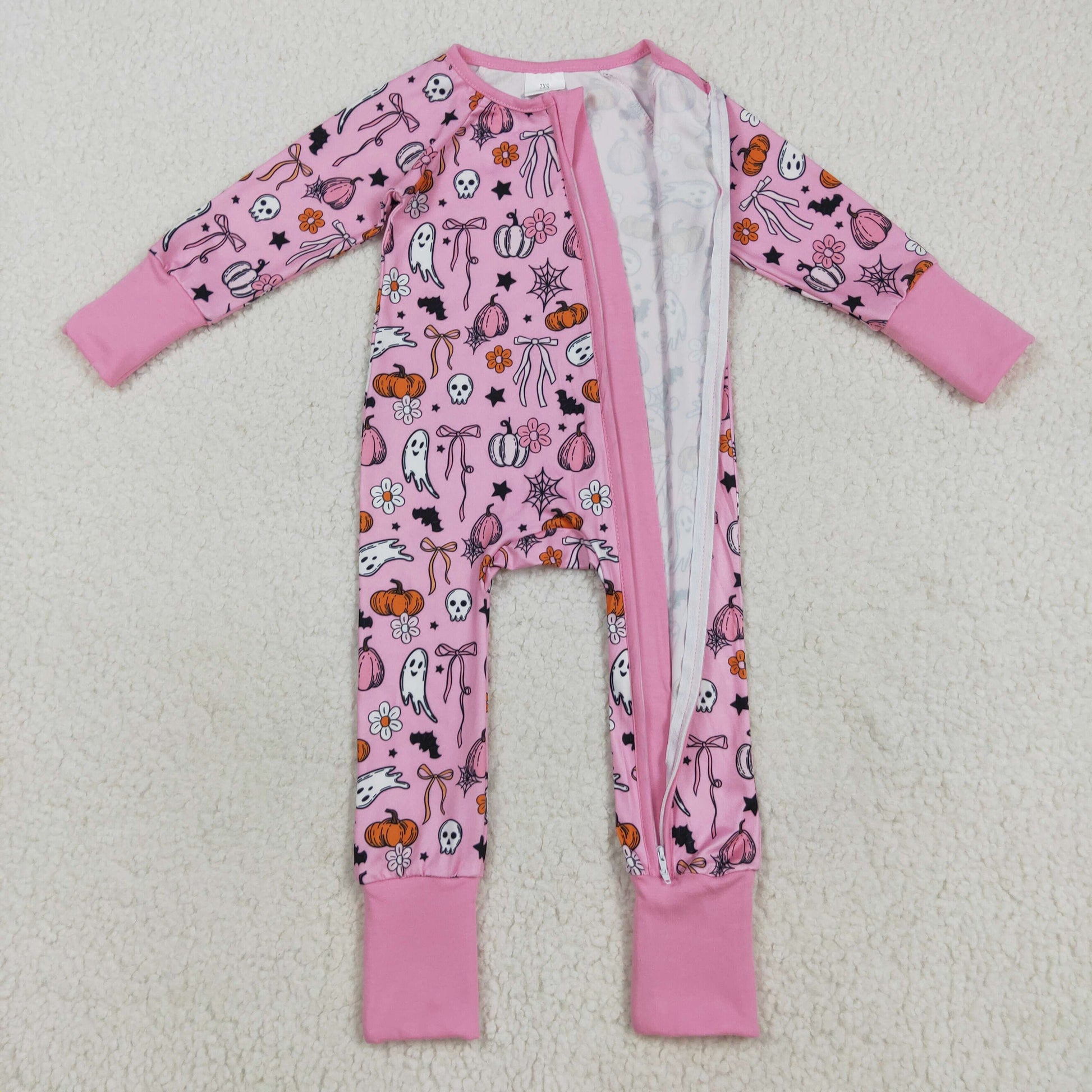 Baby Girl Long Sleeves Ghost Pumpkins Bows Flower Zipper Halloween Pink Romper RTS