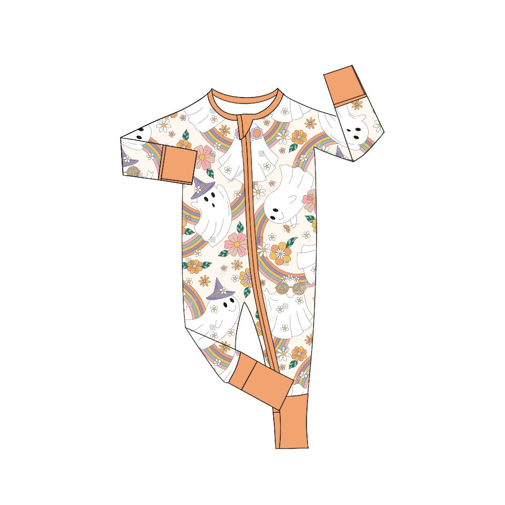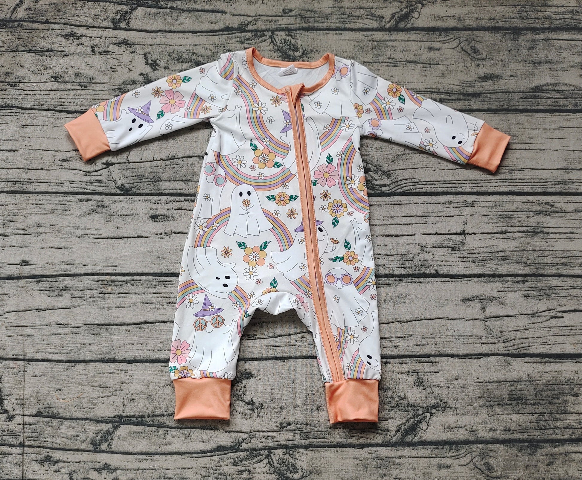 Baby Girl Bamboo Long Sleeves Halloween Fall Ghost Rainbow Flower Zipper Romper