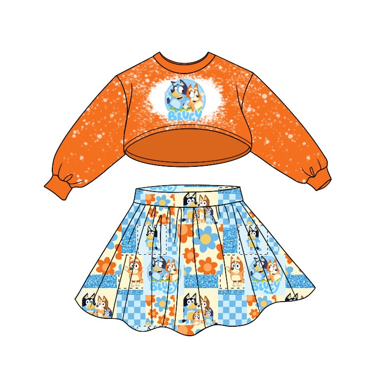 Baby Girl Orange Long Sleeves Tops Dogs Flower Skirt Outfit Moq 5