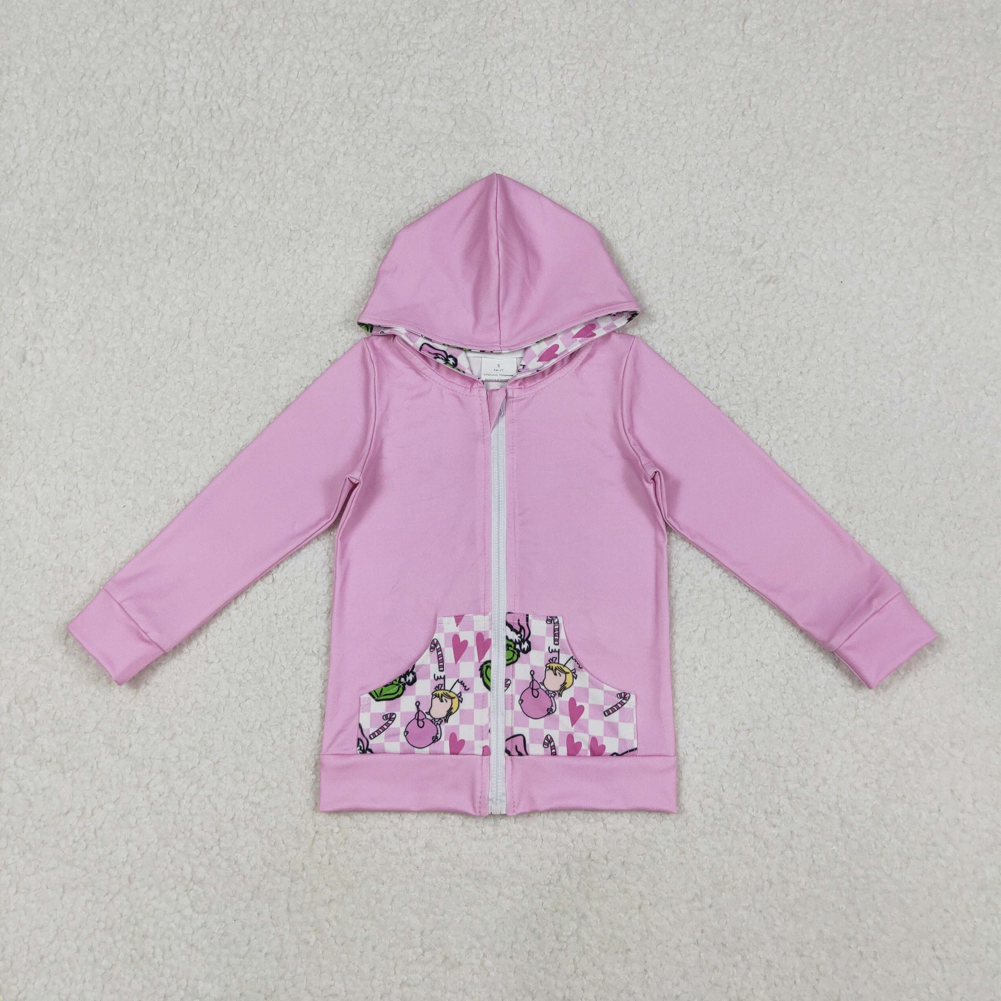 Baby Girl Pink Long Sleeves Green Face Christmas Hoodie Zipper Pockets Tops RTS