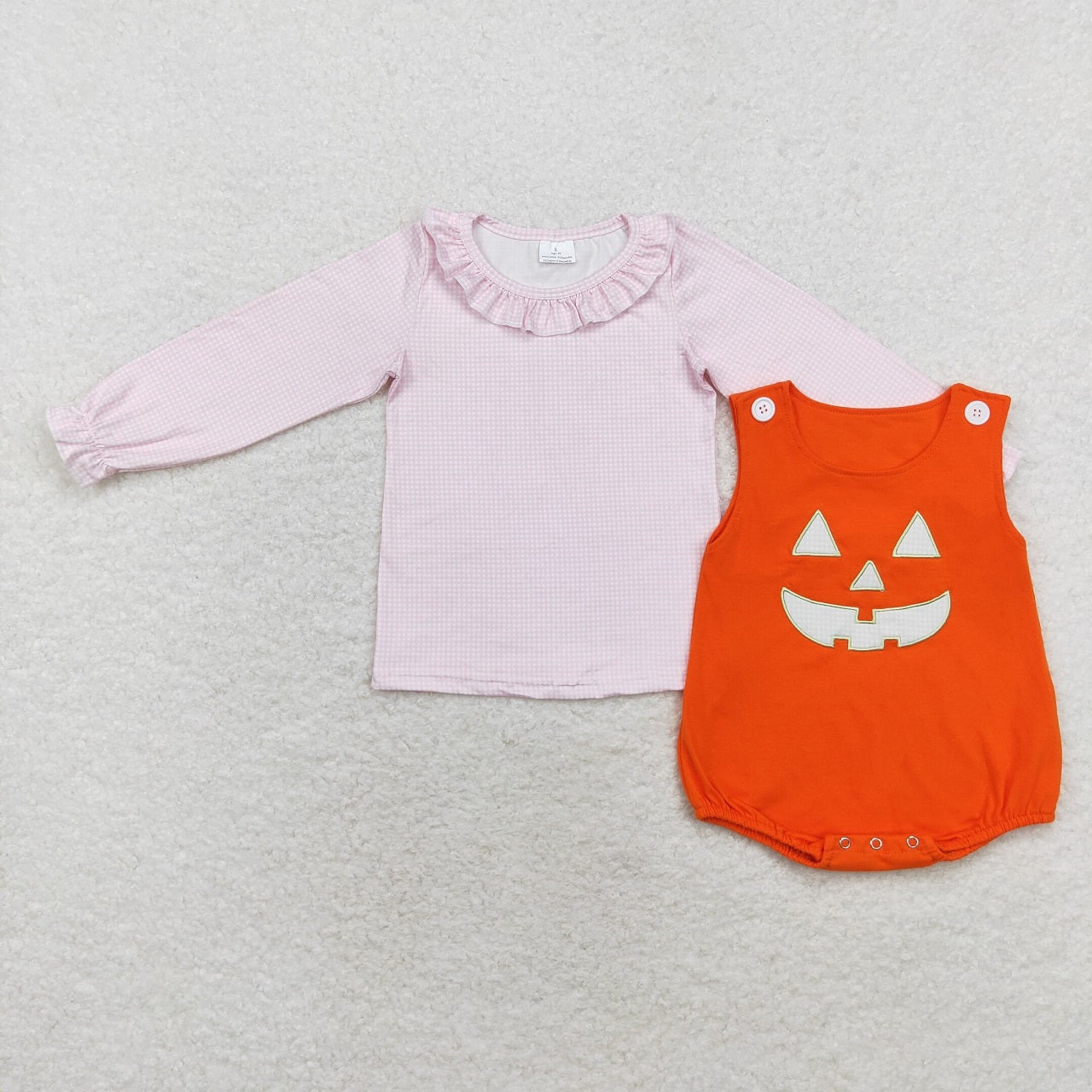 Baby Girl Pink Shirt Embroidery Ghost Face Orange Romper Halloween Set
