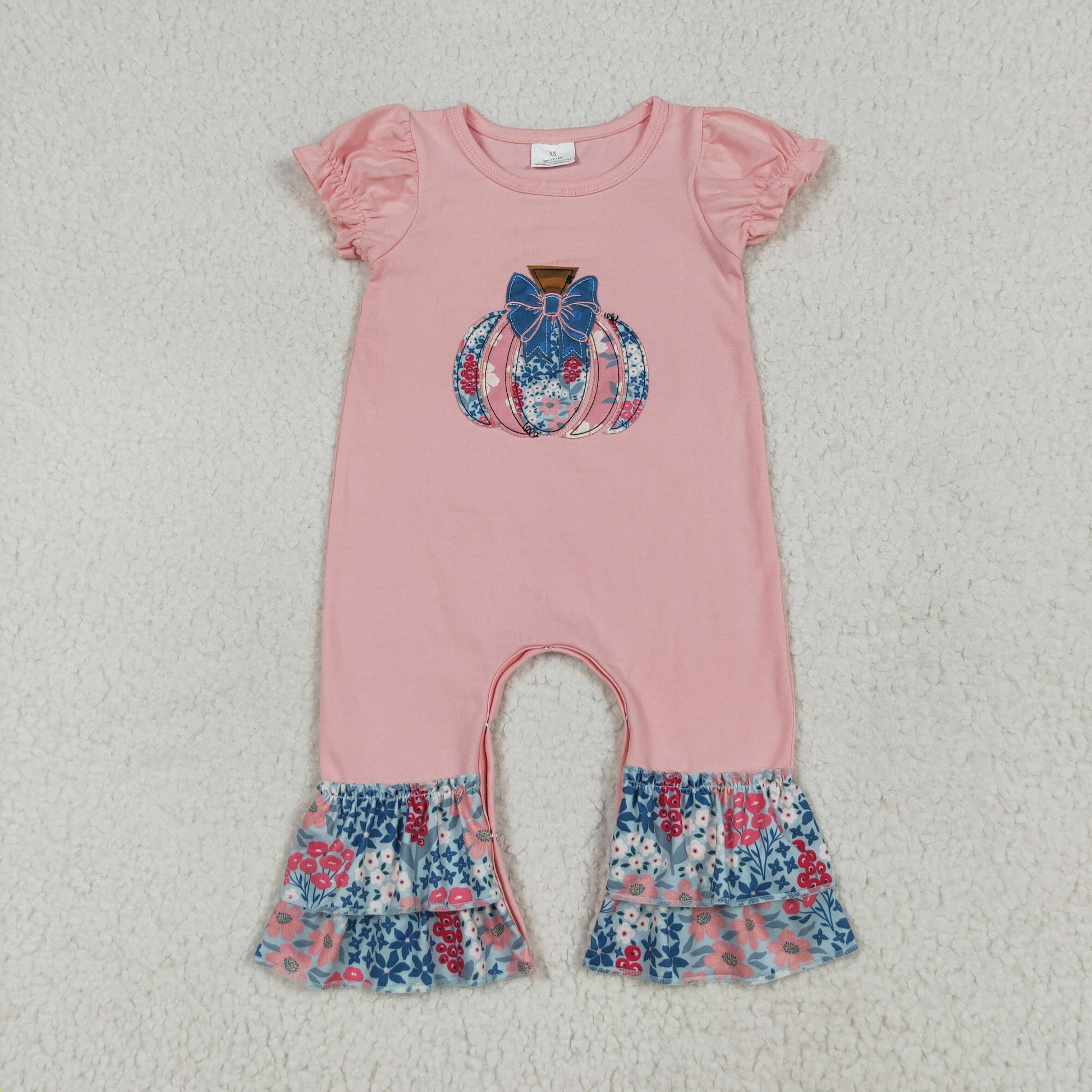Baby Girl Pink Short Sleeves Embroidery Flower Pumpkin Ruffle Romper RTS