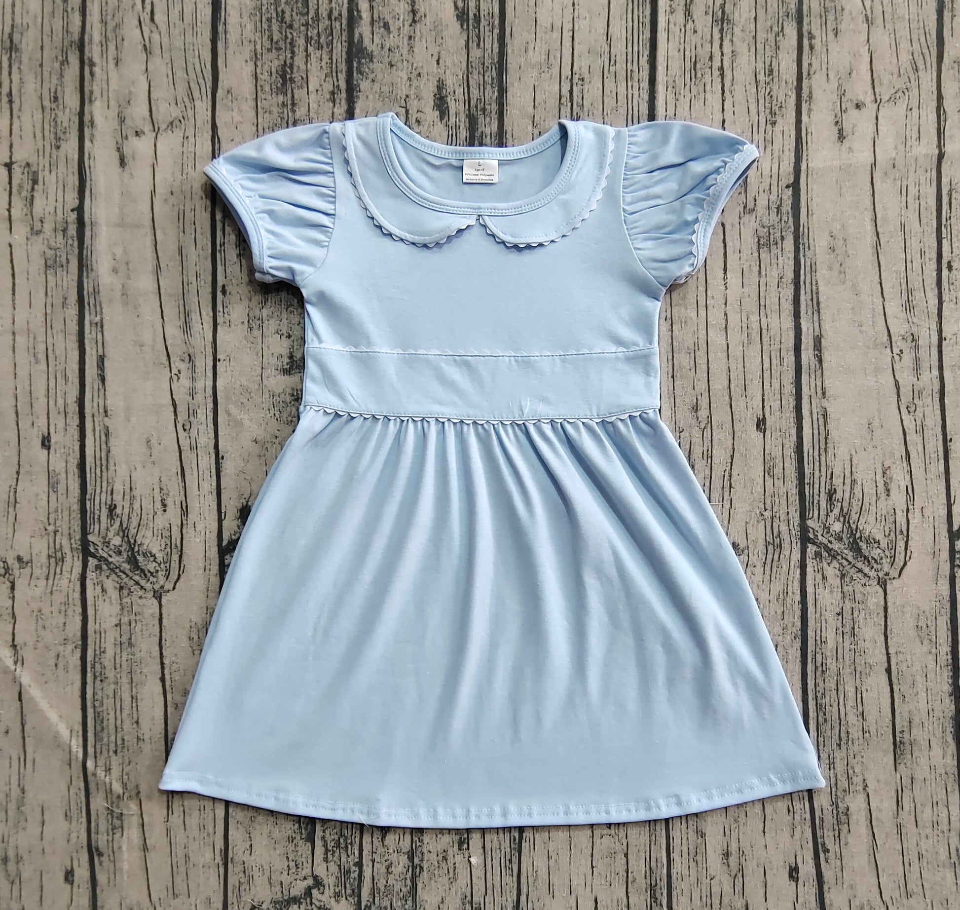 Baby Girl Short Ruffle Sleeves Blue Cotton Knee Length Dress RTS