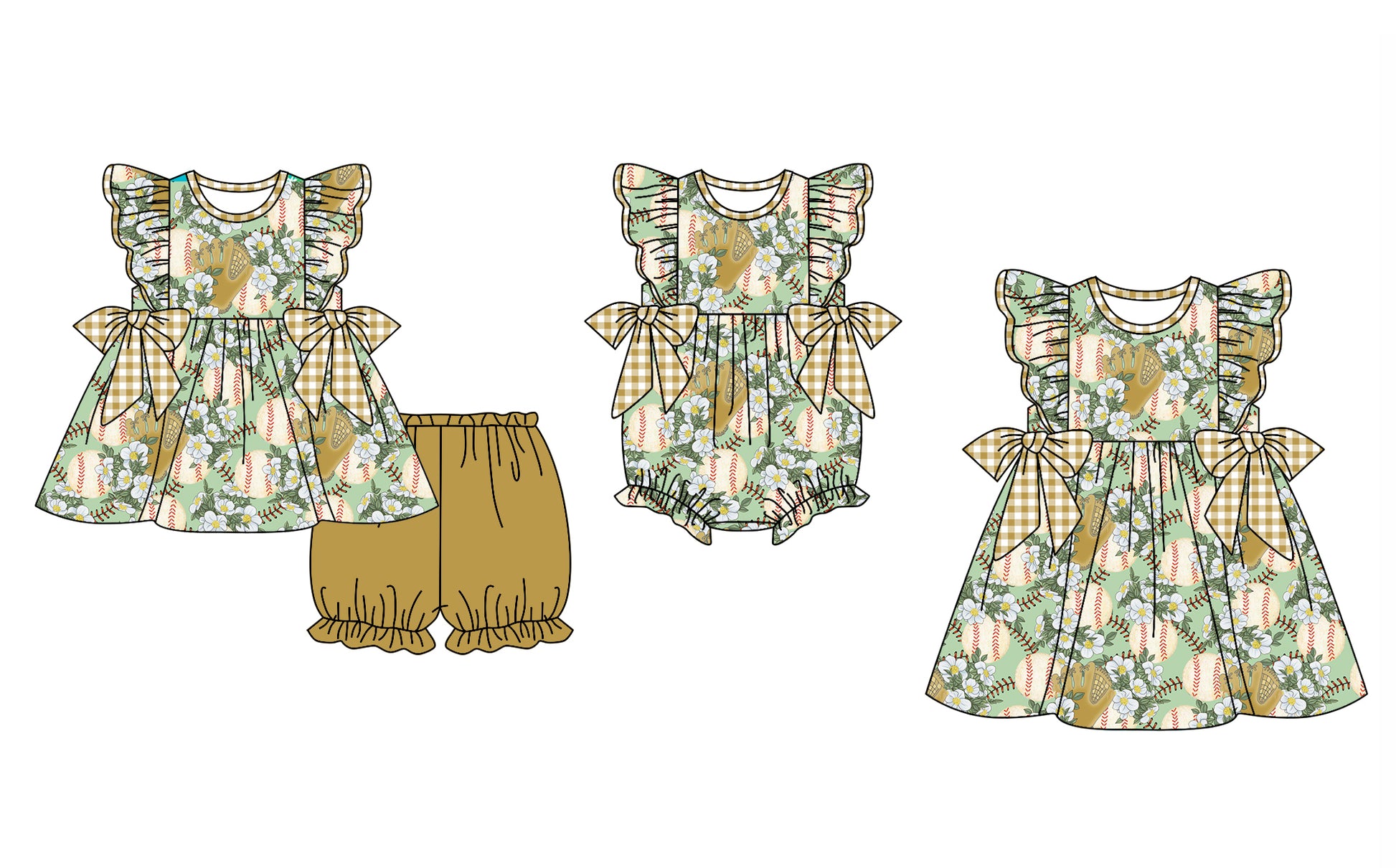 Baby Girl Short Sleeves Baseball Flower Sibling Romper Dress Clothes Set ( Moq 5 Each Design ) 11.30