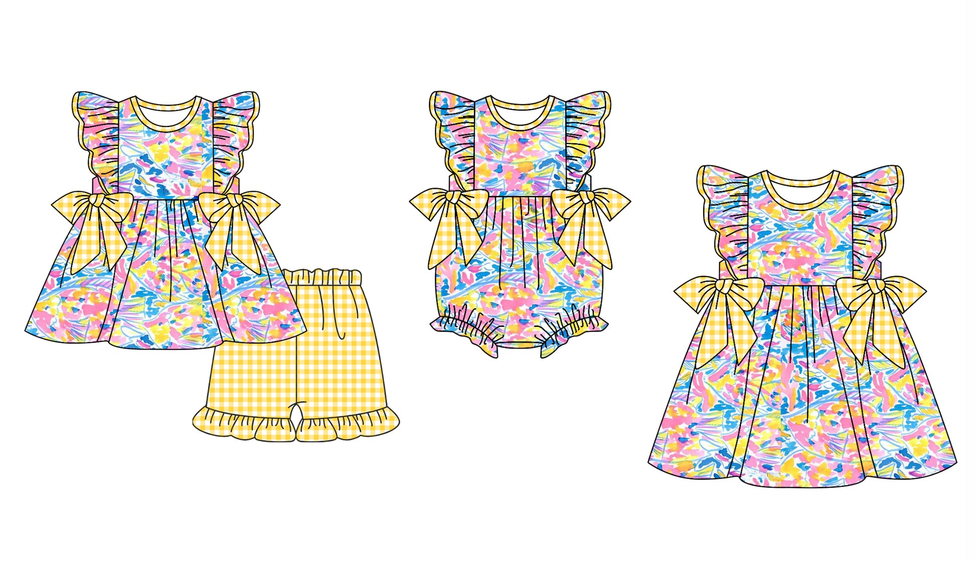 Baby Girl Short Sleeves Baseball Flower Yellow Bows Romper Dress Clothes Set ( Moq 5 Each Design )12.2