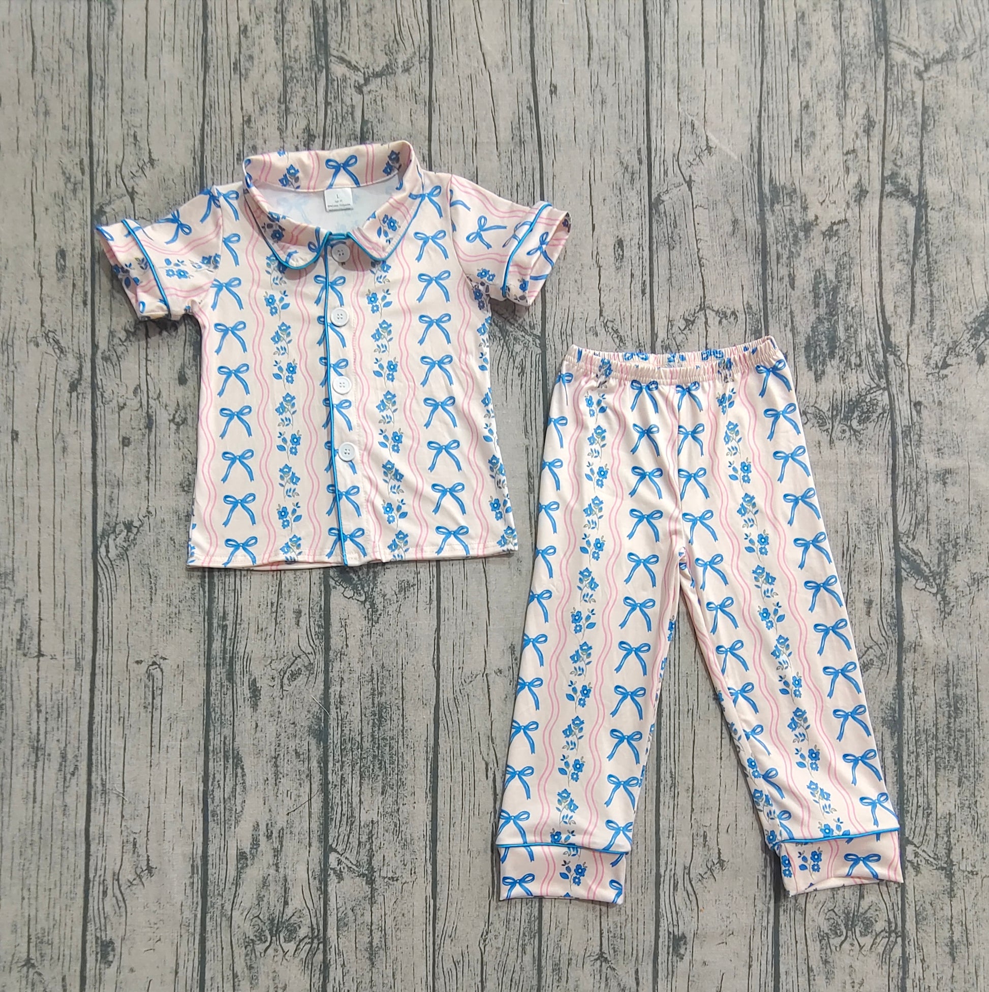 Baby Girl Short Sleeves Blue Bows Flower Buttons Shirt Pants Pajamas Set RTS