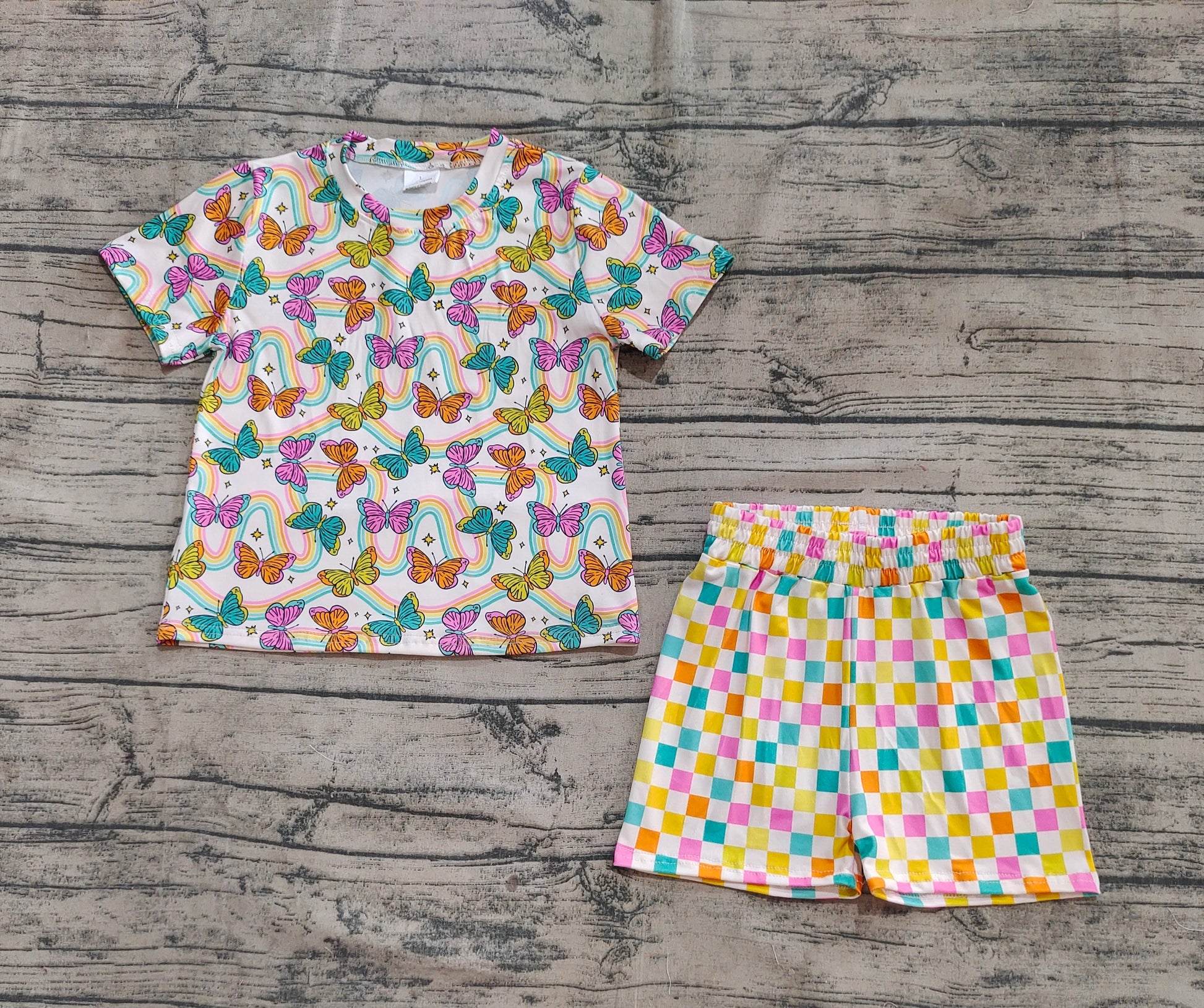 Baby Girl Short Sleeves Butterfly Rainbows Tops Checked Shorts Pajamas Set RTS