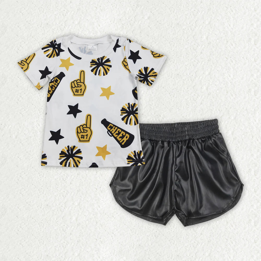 Baby Girl Short Sleeves Cheer Shirt Leather Shorts Set Sibling Summer Team Clothes RTS
